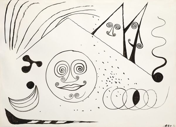 Curator: Here we have Joan Miró's "Graphisme Concret" from 1952. It's a striking example of his abstract surrealist style, rendered with watercolor and touches of impasto. Editor: It certainly strikes a playful tone. The stark black lines against the cream backdrop create a visual rhythm. I'm drawn to the circle with its almost cartoonish eyes—it gives the composition a focal point, but its lightness suggests movement. Curator: Absolutely, and seeing as this was made during the Franco regime in Spain, it is worth considering how Miró’s abstract vocabulary worked as a subversive means of expression. Consider how figuration offered artists like him to express their discomfort without directly alluding to real life. Editor: I appreciate that perspective, and looking closely, the balance of the composition seems deliberately disrupted, pushing against conventional harmony. The impasto application of watercolor, too, gives the work a tactile quality at odds with its apparent simplicity, further adding to its visual depth. Curator: And don't overlook the use of line, or perhaps its deconstruction. Lines form symbols and abstract shapes that almost suggest an unknown alphabet or script. This echoes the political urgency of searching for alternative communication amidst suppression. Editor: You're right, it evokes that feeling of clandestine messaging. The recurring motif of the circle containing a face gives it a universal aspect, reminding one of identity. Its abstracted features can signify the distortion of truth and humanity in turbulent socio-political times. Curator: I'm particularly struck by how, despite its abstraction, we project a narrative. Perhaps one centered around resistance or survival, even with whimsical aesthetic qualities. Editor: Indeed, the dialogue between form and socio-political context invites endless exploration. It demonstrates the capability of abstract art not just to express the interior, but to externalize deep communal struggles. Curator: Agreed. It offers us a window into understanding historical undertones, highlighting Miró’s commitment as an artist and citizen. Editor: A fascinating piece indeed, urging us to look beyond the playful facade and uncover the socio-political depth woven within its form.