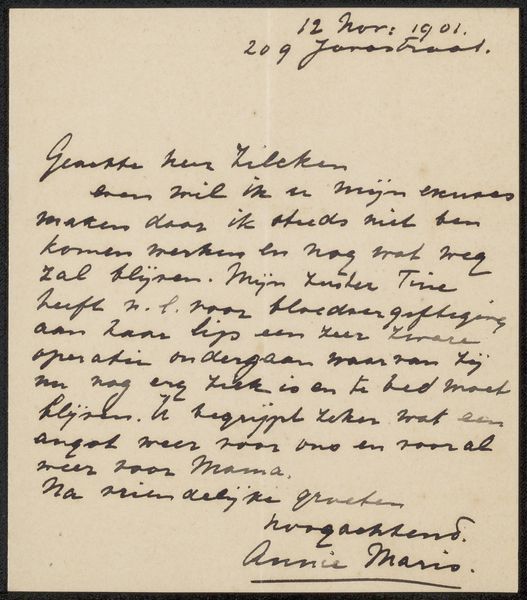 Editor: Here we have George Hendrik Breitner’s “Brief aan Jan Veth,” likely penned between 1892 and 1895. It's an ink drawing created with a pen. It’s essentially a handwritten letter and while the script is elegant, it seems incredibly personal, almost vulnerable. What story do you think this tells? Curator: Ah, Breitner's letter! It whispers of friendship and creative exchange, wouldn't you say? I find these glimpses into artists' personal lives utterly compelling, like finding a key to their inner worlds. The hurried script hints at intimacy, thoughts flowing unrestrained. It’s impressionistic in its own way. Editor: Impressionistic writing, I like that idea! But, who was Jan Veth, and why would Breitner, known for his paintings, be sending him a letter that now resides in the Rijksmuseum? Curator: Jan Veth was a very prominent art critic, painter, and poet, and a key figure in the Dutch art scene. So, I see this less as a mundane correspondence and more as a vital conversation between two artistic souls! What secrets about artistic influence do you think the letter contains? Editor: I imagine them debating artistic theories and techniques, sharing ideas over coffee… it’s fun to think about. Was this common, for artists to correspond so openly about their work? Curator: Oh, absolutely! These dialogues shaped artistic movements. Letters were Instagram before Instagram existed! I imagine Breitner expressing frustrations, seeking Veth’s opinion, perhaps even boasting a bit. We only get Breitner’s side, so it prompts the delicious game of trying to fill in Veth’s responses! Editor: It’s like overhearing half a conversation and piecing together the rest. I never thought about letters in a museum having so much artistic energy within. Curator: Precisely! Every stroke of that pen is a testament to human connection, inspiration, and the lively discourse that fueled the art world then, as it still does today.