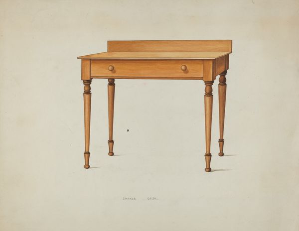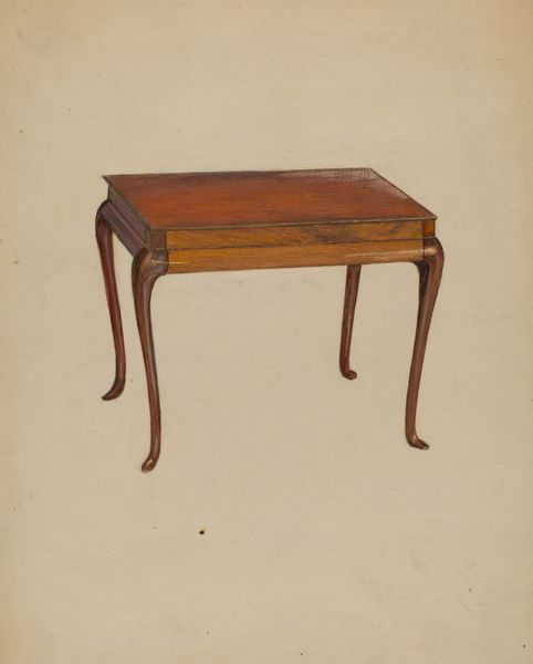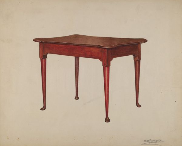Curator: This is “Tea Table,” a watercolor by Isadore Goldberg, created around 1939. What's your initial take? Editor: Elegant melancholy! It reminds me of hushed drawing rooms, the clink of china… and secrets whispered over Earl Grey. There's a strange loneliness to it, even for furniture. Curator: Indeed, Goldberg's modernist aesthetic here strips the subject of excess. It foregrounds form, material, and function: note the Queen Anne legs, their production deeply embedded in furniture-making history. We see mahogany rendered with remarkable precision through watercolor, elevating a domestic object to art. Editor: Mahogany always whispers luxury to me, of colonial exploits and distant lands fueling this…table's creation. Yet, Goldberg's chosen medium feels so delicate, almost apologetic, undercutting the imperial undertones. Curator: Perhaps that fragility reflects the changing times. Mass production was altering furniture availability and aesthetics then. Was this artistic preservation, a nod to skilled craftsmanship becoming obsolete? Editor: Absolutely, or maybe it's nostalgia tinged with unease. Look at how he renders the wood grain – a testament to the natural world, but also to our intervention. It’s beauty crafted, bought, owned. I can almost smell the wood polish and…a faint, almost metallic, scent. Curator: That’s an interesting reading, given the probable labour involved in constructing such tables then, often elided when thinking of consumption. Watercolor itself—its accessibility and supposed "domesticity"—also disrupts hierarchies. High art depicting something equally domestic. Editor: And by choosing such a common item, and making it so precious, Goldberg forces us to consider: What are we valuing, the object or the labour involved in creating it? Is it art imitating life, or is life staged and framed for art's sake? Curator: Exactly. It highlights how taste is a product too, shaped by socio-economic forces and cultural trends, not innate to individuals. It seems the artist invites us to consider design, labour, material and the ways that each impact our understanding. Editor: It seems even humble furniture can lead to a whole new set of perspectives on the world around us. Next time I’m sipping tea I know what I will be thinking about!