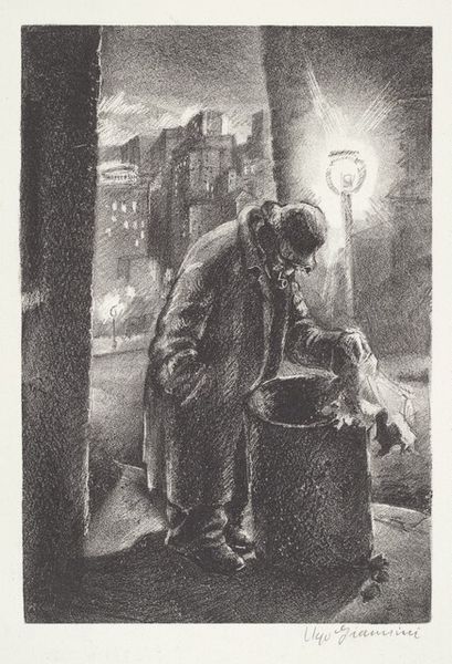 Fritz Eichenberg made this engraving to illustrate a scene from Dostoyevsky’s novel "The Brothers Karamazov." Eichenberg was a German-American artist who fled Nazi Germany in the 1930s. He made a name for himself illustrating works of classic literature that explored profound social and ethical themes. Here, the harsh and angular lines reflect the psychological turmoil of Dostoyevsky’s characters. The exaggerated shadows evoke a sense of foreboding and moral uncertainty. Note how the oppressive architecture of the city seems to close in on the figures, mirroring their internal conflicts. The light post suggests a moment of illumination or potential redemption, while the fleeing figure emphasizes the sense of alienation. To fully understand this image, it’s helpful to look into the history of literary illustration and the socio-political context of Eichenberg’s life. What can it tell us about the role of art in engaging with complex ideas? Exploring these avenues enriches our appreciation.