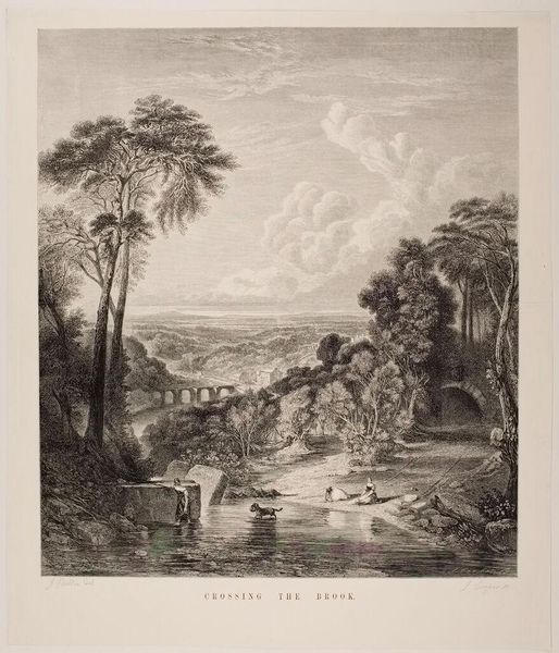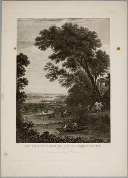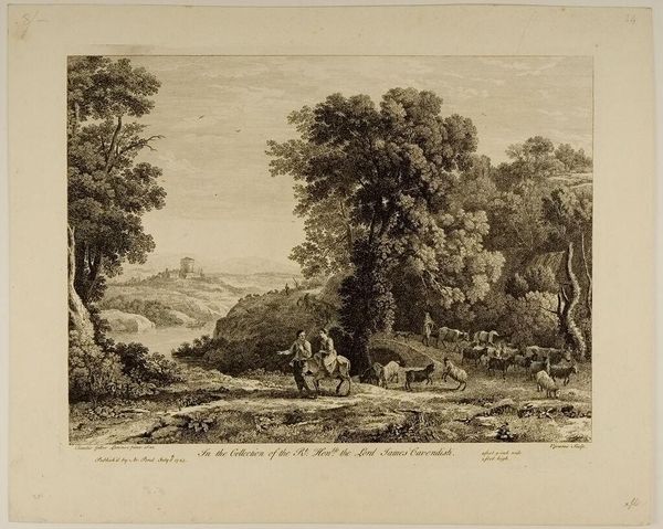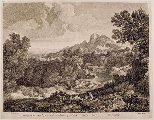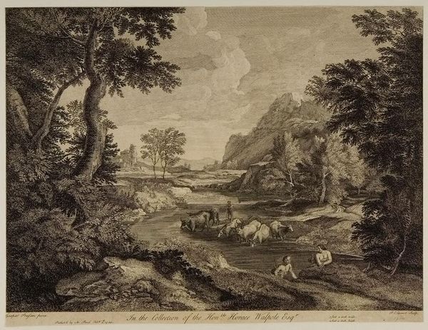 Curator: Here we have Friedrich Wilhelm Gmelin's "The Tomb of Poussin." Gmelin, who lived from 1745 to 1821, captures an imagined scene, not a real place. Editor: It’s so melancholic. The sepia tones give it a washed-out, dreamlike quality, like a memory fading. Curator: Yes, it evokes a yearning for classical antiquity. Note how Gmelin carefully structures the landscape, using light and shadow to guide the eye. Editor: I’m drawn to the tiny figures near the water. Are they meant to represent an idyllic past, perhaps? Curator: Precisely. They reinforce the theme of pastoral simplicity. Gmelin uses the composition to create a sense of timelessness. Editor: It really pulls you in. You can almost hear the soft lapping of water against those weathered stones. So evocative. Curator: Indeed, Gmelin invites us to reflect on the passage of time and the enduring power of art. Editor: It’s a gentle reminder that even in ruins, beauty persists.