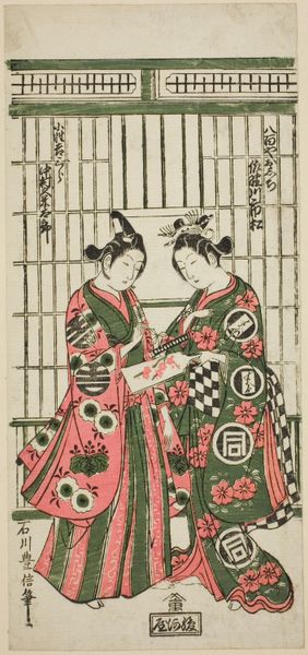 Editor: This woodblock print by Torii Kiyohiro portrays actors as Matsuwaka and Mumewaka. The figures are so elegant! What do you think this print reveals about the role of Kabuki theater in Japanese society at the time? Curator: This print speaks volumes. Kabuki wasn't just entertainment; it was a powerful cultural force. Notice how the actors are idealized, almost elevated. This helped shape public perceptions of masculinity and beauty. How do you think the print’s circulation affected the actors' celebrity? Editor: It probably amplified it, reaching wider audiences and solidifying their status! It's like early modern celebrity culture. Curator: Precisely! And the patronage system surrounding these prints – actors, publishers, fans – created a fascinating intersection of art, commerce, and social identity. Thinking about it this way gives us a window into the cultural values of the era. Editor: I never thought about it like that. Thanks!