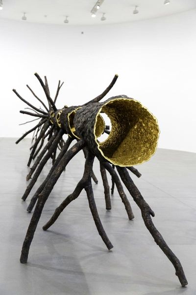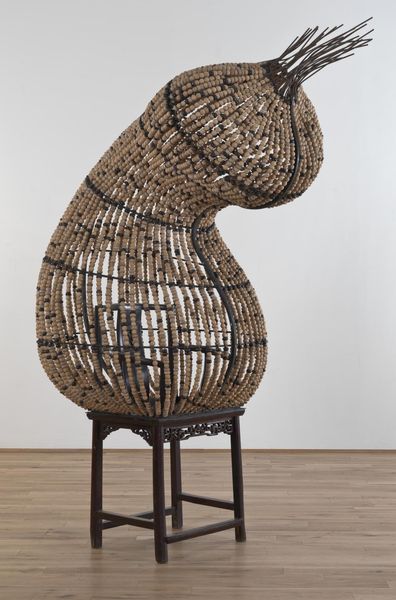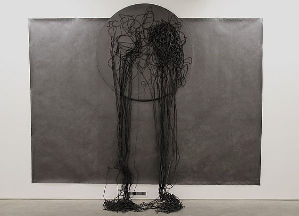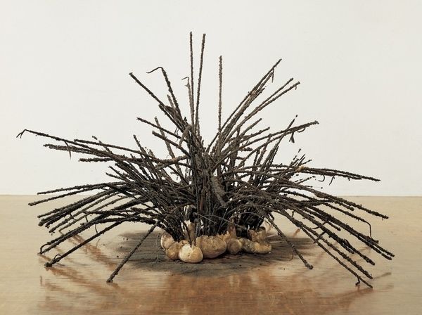 Eva Hesse made this sculpture, "Vertiginous Detour," from industrial materials and processes, challenging traditional art materials. The work's appearance is significantly influenced by the choice of materials, especially the contrast between the open netting and the dense, dark mass it contains. Consider the inherent qualities of these materials: the netting’s lightness and give, and the solid weight of the ball, each contributing to the sculpture's dynamic tension. The artist’s labor is evident in the intricate construction of the netting and the careful assembly of the inner mass. Hesse engages with traditions beyond fine arts, incorporating techniques from fiber arts and industrial production. These decisions are tied to wider social issues of labor and consumption, as she elevates everyday materials to the realm of fine art through painstaking and often repetitive processes. Understanding the full meaning of "Vertiginous Detour" requires considering Hesse’s conscious engagement with materials and making, thereby challenging traditional distinctions between art and craft.