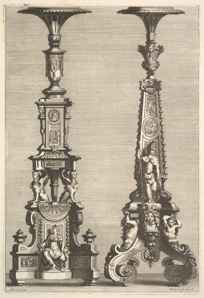 This print, made by Johannes or Lucas van Doetechum, shows a free-standing round well with double columns. The image is made using the technique of etching, a printmaking process where lines are incised into a metal plate with acid, allowing for highly detailed designs. The material of this print, the etched lines on paper, simulates a complex three-dimensional structure. Consider the laborious processes involved in creating the original well, with its ornate carvings, figures, and architectural elements. These features are meticulously replicated through the etching process. The print not only captures the appearance of the well but also reflects the social context in which such structures were valued, speaking to the importance of communal resources and civic pride. This print elevates what would have been a common place for the distribution of water into a display of artistry and status, underscoring the importance of materials, making, and context in understanding the full meaning of the artwork.