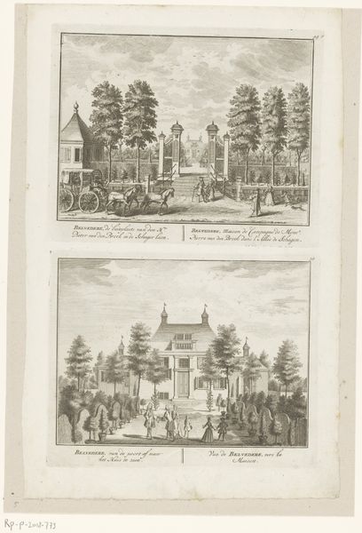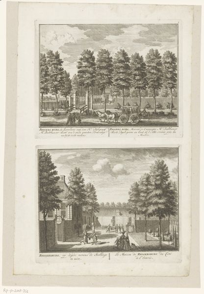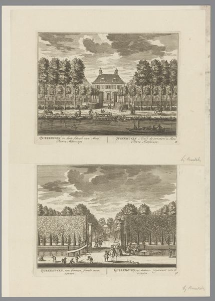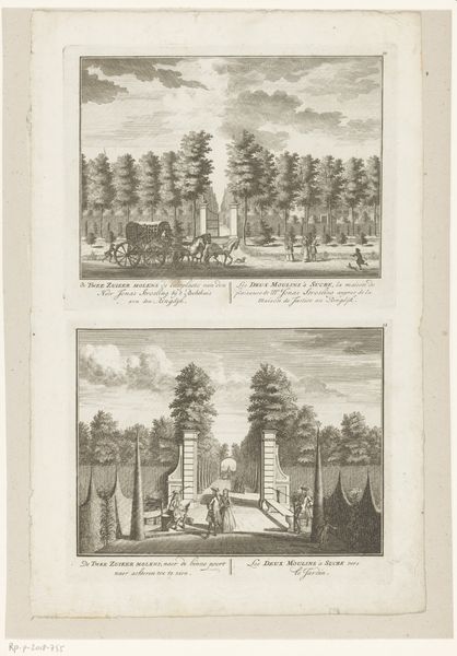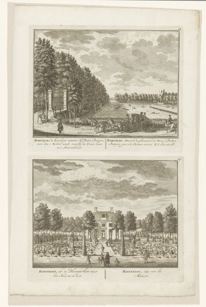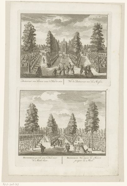 Curator: Look at this wonderful print titled, "Gezicht vanaf buitenplaats Meer en Burg op de tuinen en gezicht op de Middenweg en buitenplaats Zorgwijk." Created sometime between 1725 and 1768, the artist is anonymous, though the work now resides in the Rijksmuseum. Editor: Instantly, I’m transported. It feels like a perfectly manicured dreamscape. I notice the obsessive symmetry; almost too perfect to be real. But look at how serene it all seems, a tranquil order amidst what was probably a very chaotic era. Curator: Precisely. Consider the formal gardens depicted, the symmetrical layouts – these reflect more than just an aesthetic. These meticulously planned spaces were physical manifestations of Enlightenment ideals: order, reason, control over nature. Each tree carefully placed represents a mastery over the wild. Editor: It’s almost… unsettling, isn't it? The control is so absolute. It feels more like a stage set than a garden meant for actual wandering. I keep expecting tiny clockwork figures to parade along those paths. What about the light? How does the engraving technique shape our experience here? Curator: The sharp lines and controlled shading of the engraving reinforce the feeling of precision. Each detail, from the leaves of the trees to the figures strolling, is meticulously rendered. The genre scenes serve to highlight this contrast. Even recreation is structured! We see people enjoying the spaces, reinforcing the garden's status. Editor: True! So what deeper story does this imagery tell us, do you think? Is there a warning in this beautiful constraint? I'm getting vibes of controlled anxiety here… Maybe it hints at the illusion of control. Or perhaps even at what we, as viewers, surrender when we choose such meticulously designed order. Curator: Perhaps. Consider how our contemporary moment might interpret these scenes – climate change, ecological concerns. These pristine landscapes might trigger complex feelings about human ambition. We are looking at something created from one era, viewing it through lenses of our own. Editor: Fascinating! It has been really interesting examining how a landscape, meticulously ordered, evokes so many layered thoughts.