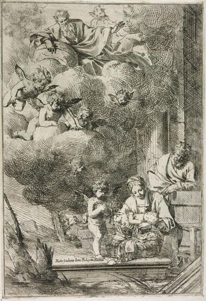 Curator: Jean-Honoré Fragonard created this etching, "The Banquet of Anthony and Cleopatra", between 1763 and 1764. It’s currently held at the Metropolitan Museum of Art. Editor: Immediately, the delicate, almost scratchy lines jump out. It has this unfinished quality, but the scene still feels incredibly rich. All that texture from just an etching! Curator: Well, consider the era! The 18th century print market drove innovation. Artists like Fragonard were expanding the reach of painting, enabling their distribution as affordable decoratives in a vastly expanded commercial market. These images spread knowledge, reinforced political power and morality tales of the ruling elite to an expanding public viewership. Editor: It’s interesting to think about this medium in terms of labor too. Etching requires a specific set of skills, acid-resist application, careful scoring of lines, the biting process, and then ultimately the printing, the inking and press work; quite involved, but so unlike painting. Did he do his own printing here, or were workshops typically involved by then? Curator: It’s likely that a workshop handled the printing, though Fragonard, familiar with all phases, designed with distribution and interpretation always in mind. This print references painting but creates an artwork on paper with a character of its own; available in many impressions at much lower costs for new buyers and collectors who valued “painting.” It promoted Fragonard’s skill while broadcasting classical subjects with serious intent, Editor: And the banquet scene itself, what significance does that story hold? Curator: The banquet of Anthony and Cleopatra has been fodder for artists across centuries, functioning in the 18th century as cautionary tales of reckless expenditure. Think about it: wealth and power squandered in pursuit of romantic obsession. Here it serves not only as decoration, but as a constant social and political reminder. Editor: It is impressive how such delicate lines and gradations in tone still create a real sense of volume and atmosphere. This almost fleeting moment still manages to speak volumes about craftsmanship and class dynamics. I find it more interesting the more I think about its production, market and intention. Curator: Exactly, and it underscores how art like this played a vital role in disseminating cultural narratives. So much more than pretty decoration.
