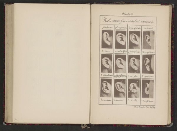 This is a book page by Dugast and Felix Geoffray displaying sixteen images of ears, arranged by form. The images are presented in a grid, emphasizing the anatomical structure and variations in shape. The monochromatic palette simplifies the forms, allowing us to focus on the lines and contours that define each ear. The ordered arrangement might at first appear as a scientific classification, yet it also invites us to consider how these minute variations contribute to individual identity. This ordered structure echoes broader philosophical concerns about categorization and the human impulse to impose order on the natural world. The act of isolating and categorizing these features disrupts our understanding of the human form as a unified whole. Notice how the contrast between light and shadow renders each ear three-dimensional. This interplay of light animates the static images, suggesting a tension between objectivity and perception. It reminds us that even in the most methodical observation, subjective interpretation plays an unavoidable role.