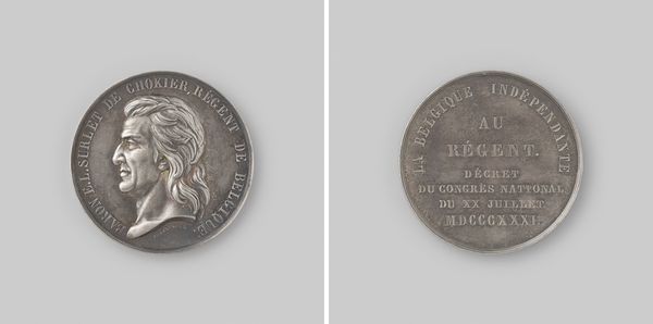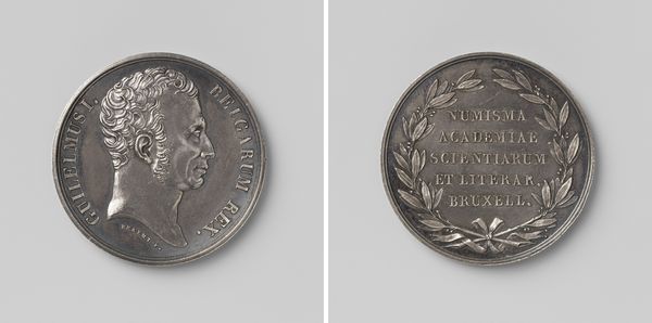 Curator: Here we have a bronze engraving by Joseph-Pierre Braemt created in 1816 entitled "Koninklijke Academie van Wetenschappen en Letteren te Brussel." Editor: Its austere circular format evokes a coin or medal. The low relief creates a cool, classical solemnity, almost like peering into the distant past, but it simultaneously speaks of honoring a particular institution. Curator: Indeed. As a product of Neoclassicism, the piece adheres to a carefully balanced composition, dividing itself into obverse and reverse designs each within the circular frame. Notice the text precisely following the circumference on one side. Editor: The laurel wreath circling the inscription feels instantly recognizable. Laurel wreaths represent victory, honor, and achievement, linking this academy to a long and powerful history of knowledge and success. They’re so enduring; even today we recognize the symbolism! Curator: Precisely. Braemt uses these formal elements—the controlled line work, the shallow depth, the calculated arrangement of text and image—to convey a sense of order and rationality consistent with the ideals of the Enlightenment, very appropriate given its depiction of the Royal Academy. Editor: The portrait on the obverse feels like a specific claim to power. The subject's rigid profile, combined with the Latin inscription “Wilhelmus I. Belgarium Rex” conveys the weight of royal authority. The portrait anchors the abstract ideal of the academy to a tangible, contemporary power. Curator: I agree, however, one can look at it simply as a signifier as well; it anchors it to a period in time without conveying other emotions. It operates on the level of a signature. Editor: To me, there is a timelessness embedded in its presentation that echoes sentiments still very present today. Perhaps more strongly today, because we see Neoclassical depictions as inherently related to our understanding of western power. Curator: The cool detachment really emphasizes the symbolic aspects. The precision and the reduction to essentials help to express these intellectual ideas, regardless of sentiment. Editor: It certainly leaves one pondering the longevity of symbols and their meanings throughout time. Curator: Yes, its ability to achieve the timeless is really its appeal and that begins and ends with the balance and compositional techniques employed.