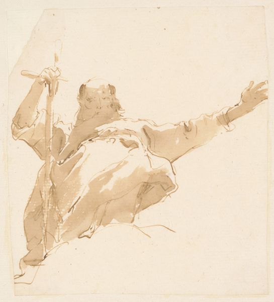Curator: We are now looking at "Drapery Study of a Woman with an Outstretched Arm," a pencil drawing on paper, dating back to somewhere between 1765 and 1785, by Louis Lagrenée, and residing here at the Metropolitan Museum of Art. Editor: First impression? This sketch is surprisingly commanding for something that feels like a study. There’s an energy in that extended arm, like she's either reaching for something incredibly important or dramatically refusing an offer. It's compelling, even without a face. Curator: Indeed. It’s precisely this expressiveness that makes it so captivating. During the Rococo period, academies heavily emphasized preliminary sketches like this, especially studies of drapery. They allowed artists to master the fall and play of fabric, a crucial skill for historical and mythological paintings. Editor: Fabric as its own art form, huh? Looking closely, you can see how much focus Lagrenée dedicated to capturing the weight and texture. The way the light catches those folds is almost sensual. It gives the figure a tangible presence even in its unfinished state. It has a baroque flourish. Curator: Absolutely. Drapery studies were also about conveying emotion and social status. The way fabric flowed and wrapped around a figure could communicate virtue, authority, or even vulnerability, depending on the context of the final painting. Remember, academies promoted a codified language of gesture and form. Editor: So it's like fabric as social semaphore? I like that idea. It also makes me appreciate how much this sketch stands on its own. There's a universality to the gesture, an echo of movement caught in time. It reminds me of seeing dancers preparing, the raw power before the perfected performance. Curator: Precisely! It exemplifies how these seemingly technical studies could transcend their original purpose to become compelling artworks themselves. They offered a glimpse into the artist's process, showcasing skill but also a sense of immediacy that is absent from more formal paintings. Editor: Well, I’m grateful this “practice round” ended up in a museum. It really spotlights the artistry inherent in observation itself. Curator: And its position within the artistic practices of its era helps to ground its significance for modern viewers as well.