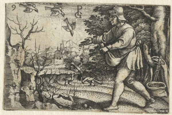 Editor: We’re looking at Virgil Solis’s “Stag and Hare Hunt,” created sometime between 1530 and 1562. It's an engraving currently held at the Minneapolis Institute of Art. The frantic energy of the hunting dogs is really something. What do you see in this piece from a formalist perspective? Curator: The immediate point of entry resides within the interplay of line and space. Solis’s use of tightly packed, cross-hatched lines creates a dense texture, effectively rendering the frenzy you mention. Notice how the linear structure dictates movement; the eye is propelled across the horizontal plane, mimicking the hunt itself. What structural elements support this sense of kinetic energy? Editor: I guess the repetition of the dogs’ leaping forms, mirroring each other from left to right. The stark contrast between the light, open spaces of the animals’ bodies and the dark, dense background also emphasizes their movement? Curator: Precisely. Furthermore, consider the composition’s symmetry, how it affects the overall reading. The central human figures offer a moment of stasis, dividing the chaotic hunts on either side. Do you see any intentional visual cues used to direct our attention? Editor: The artist uses the figures, framing either side as a way to pull you in almost? They feel as if the composition hinges on this symmetry you mention. So you’re suggesting Solis wasn’t just depicting a hunt, but also engaging with concepts of balance and dynamism through form itself? Curator: Form is paramount. The etching, viewed through the lens of semiotics, reveals the hunt not merely as a scene but as a complex visual statement regarding nature. Hopefully, it becomes clear through visual engagement, as this provides much to think about for contemporary artists and their practice. Editor: It really does, and I didn’t see so many of these layers before. Thank you for revealing them through such insightful observations!