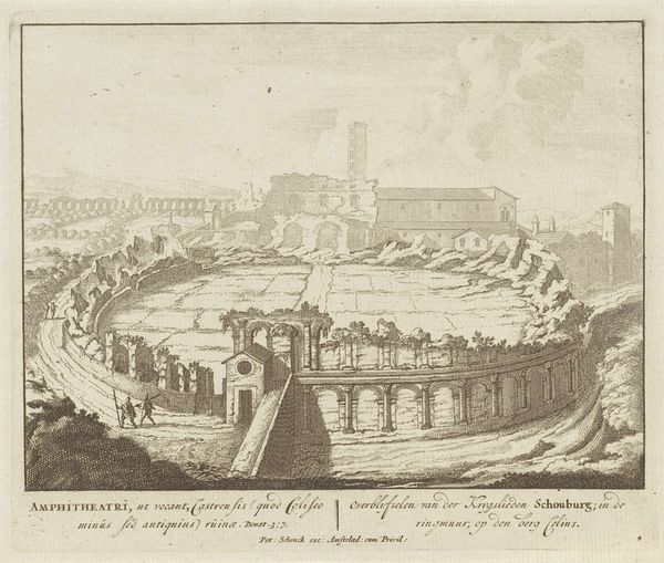 Curator: This print, "Gezicht op de Porta del Popolo, te Rome", probably made between 1675 and 1711, showcases the iconic gateway. It's unsigned, attributed only to an anonymous artist. I find myself transported to another time, peering through history's lens. Editor: Yes, it feels like looking through a window to the past! The detailed cityscape emerging behind the gate is mesmerizing. What particularly stands out to you in this baroque cityscape? Curator: For me, it is about layers. The dark foreground of the gate draws us in, but then your eye travels through it into that shimmering city. There's a delicate balance between the robust architecture in front and the sprawling vista of Rome. Have you ever thought about prints as a way of preserving – almost embalming – a particular viewpoint of a city for posterity? Editor: That’s a great point. I hadn’t considered the print as a time capsule. The linear style emphasizes the architectural details but at the same time it provides a certain bird's-eye view of a whole lifestyle. What’s your impression of that contrast, from rigid lines to expansive outlook? Curator: I think that the artist is attempting to give the impression of reality versus their memory, how space and our impressions of it can morph when the memory takes hold. Now that you mention the rigid lines, what emotional impact do you think this creates in us? Editor: Perhaps the rigidity is like Rome trying to contain all of life behind strongholds, and its baroque details almost suggest a yearning for grandeur. It seems to highlight Rome's ability to reinvent itself. Curator: Indeed, Rome is the queen of transformations. This makes me see something different entirely – the constant push and pull between grandeur and everyday life, framed eternally in ink.