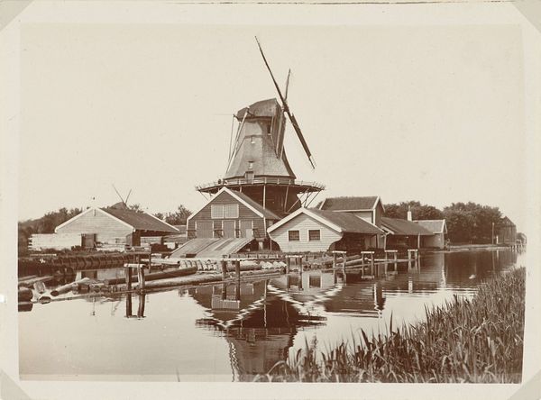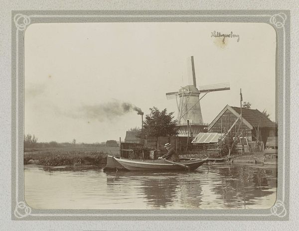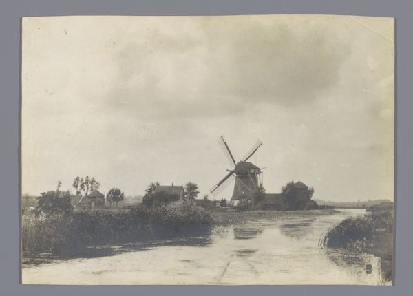 Editor: Here we have "Rivierlandschap met molen", or "Riverside Landscape with a Mill," an etching from the 1890s by Elias Stark, held at the Rijksmuseum. It's so delicate, almost like a memory. What strikes you most about it? Curator: What resonates is how Stark situates the industrial form of the windmill within a seemingly idyllic landscape. But is it truly idyllic? Consider the socio-economic context: the late 19th century witnessed massive industrial shifts, often at the expense of rural communities and traditions. Does the windmill, in its imposing presence, symbolize progress or the encroachment of industrialization on nature and traditional ways of life? What's your read? Editor: I hadn't thought of it that way. I saw the windmill as picturesque, almost comforting. But your point about industrial encroachment makes me reconsider the image's politics. Curator: Exactly. And think about the composition. The reflective water, the small figure—are they reclaiming the space or just visitors? Is there a tension between human presence and the dominance of both nature and the structure. Consider Stark's personal life and choices. How might his identity shape his engagement with the narrative of modernization and its impact on the Dutch landscape? Editor: It feels like I'm looking at the artwork with completely new eyes now! It's not just a pretty picture; it's a commentary. Curator: Precisely! Art doesn't exist in a vacuum. It’s a mirror reflecting the complex realities of its time, inviting us to critically engage with those realities. This etching then isn’t just about the visual appeal but a prompt for conversation. Editor: That's powerful. I appreciate you guiding me to see the layers of meaning within this seemingly simple landscape.