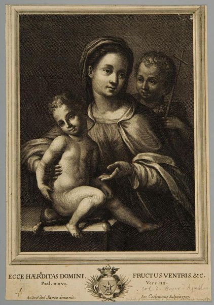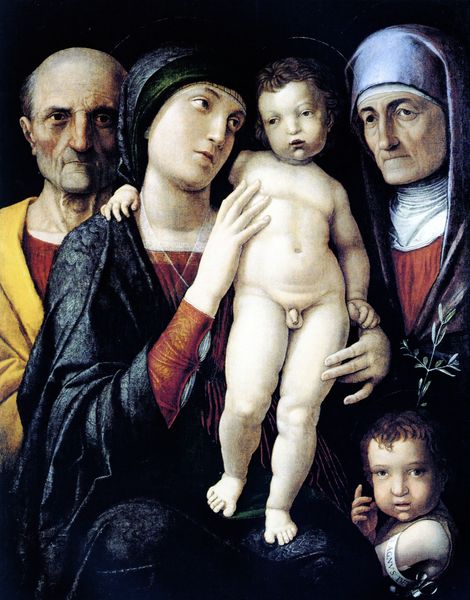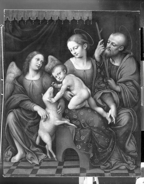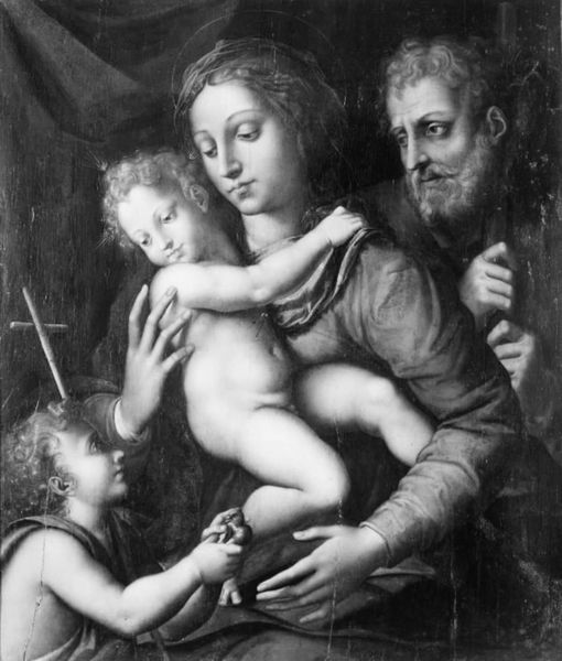This painting of The Holy Family with St John was made by an anonymous artist. Images like this one served a crucial function in European society. In the absence of widespread literacy, they visualized and disseminated core religious beliefs, reinforcing the doctrines of the Catholic Church. The figures—Mary, Joseph, Jesus, and John the Baptist—are rendered with a smoothness and idealized beauty that reflects artistic conventions of the Renaissance. This was a period when artists looked back to classical antiquity for inspiration. But, even in its reverence, this artwork implicitly comments on social structures. The tender depiction of the family unit, particularly the focus on Mary's nurturing role, elevates domestic life, and perhaps subtly challenges the dominance of the Church as the primary source of spiritual authority. Understanding its full meaning requires looking at the broader historical context: theological debates, artistic patronage, and the social functions of religious art.