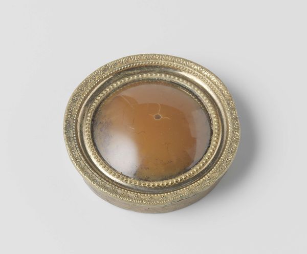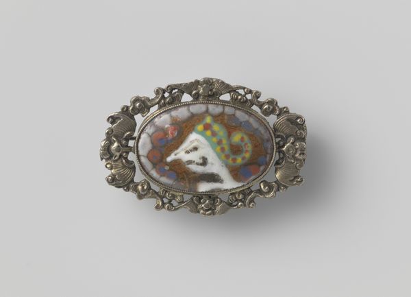 Editor: This miniature piece, created by an anonymous artist sometime in the 18th century, is called "Small boy wearing a black hat holding a heart," and it's a tempera painting. I'm struck by how such a small artwork holds so much detail. What aspects of its visual structure do you find most compelling? Curator: The layering of materials immediately strikes me: the gilded frame, the delicate lace behind, and the painted image itself. The artist utilizes the circle, not just as a frame but as a compositional element to unify these different textures. How do you perceive the use of light and shadow within the central portrait? Editor: It seems very subtle; there aren't harsh contrasts, and the color palette is subdued. How does this lack of strong contrast affect our perception of the figure and his relation to the pictorial space? Curator: Precisely. It creates an intimacy, pulling us closer to observe the details, from the boy’s face to the symbolism of the heart he clutches. Note how the framing draws our eyes into a visual orbit with subtle tonality and the repeating roundel. The formal elements contribute to the work's affective power. Editor: That's a fascinating point. Seeing it as an integrated arrangement of texture, colour and shape shifts my understanding. The frame isn't just a border; it is key. Curator: Indeed. The formal qualities serve to direct how we decode the picture's possible narrative elements. Ultimately, by understanding these key ingredients, we may engage with this intriguing baroque piece and develop a more complete and sensitive aesthetic impression. Editor: Thank you. Looking closely at how the shapes, textures and even frame all support the subject gives me a new respect for it.