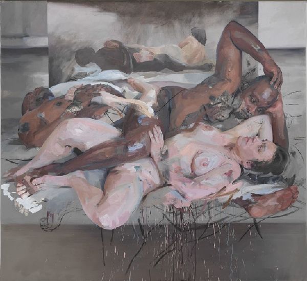 Curator: Here we have Rudolf Bér's "Falling Icarus," rendered in oil and acrylic in 1982. What are your immediate impressions? Editor: Utter chaos! The human figures seem to be in freefall, almost tumbling out of the frame. There’s this sense of uncontrolled movement, a total loss of control… or is it acceptance? Curator: Bér clearly engages with history painting here, updating a very recognizable myth with the Neo-Expressionist style of the 1980s. Think about the traditional versions—classical poise even in the fall. What does this treatment say? Editor: It hits harder. It’s raw, isn't it? Less about a graceful descent and more about the messy, brutal reality of failure. It speaks of our vulnerabilities and a fear of consequence for reaching too high. Curator: Neo-Expressionism embraced this return to figuration and emotion after conceptualism, questioning power structures and high art itself. Is this Icarus a fallen hero or a cautionary figure in an era of shifting ideologies? Editor: Fallen hero, definitely. There's something so painfully human about it, though. We can all relate to the feeling of failing. What the classic tells you in an elitist way this artwork screams in your face using distorted figures, color stains, and very gestural paint strokes. Curator: Indeed. Notice how Bér uses color. The pallid tones and rough brushstrokes create a sense of decay and the breakdown, physical and perhaps societal, emphasizing the destruction instead of romanticizing the heroic element. Editor: For sure. It is so raw and so expressive; I can almost hear Icarus falling in this painting, struggling against the forces pulling him down. But who is at the bottom there looking upwards to Icarus with that facial expression? Icarus's father? Curator: Well, perhaps that is a question that lingers with each of us. Bér is challenging us to reflect not only on the hubris of Icarus, but what has been said about that over time, its role as part of visual culture. Editor: Exactly. Thank you for opening my eyes even further to "Falling Icarus", Bér gives an intense, thought-provoking depiction that truly captures the core emotion in an unusual style that gives you a chill running down your spine!