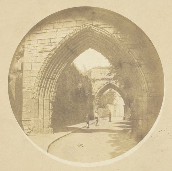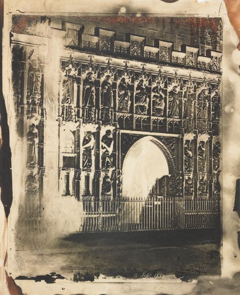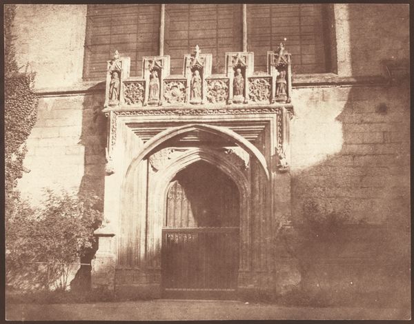 Editor: So, this is "Ancient Door, Magdalen College, Oxford," a photograph by William Henry Fox Talbot, circa 1843. It's a print, a paper daguerreotype showing... well, an old door! I'm struck by how monumental it feels, almost like a stage set, even though it's a humble subject. What do you see in this piece? Curator: I see Talbot using the nascent technology of photography to grapple with issues of power and representation deeply embedded within the British class structure. Consider the choice of subject: a venerable institution like Oxford. This door isn't just an entrance; it’s a portal into a world of privilege and exclusion, meticulously maintained over centuries. Editor: So, it’s less about the door itself and more about what the door represents? Curator: Precisely. Talbot, as a member of the elite, is both celebrating and perhaps subtly questioning the social order. Photography, in its ability to replicate and disseminate images, had the potential to democratize representation, but initially it was largely used to reinforce existing power structures, as access to it was only for those with means. Notice the almost theatrical lighting? It dramatizes the architecture, reinforcing its imposing presence. Editor: That makes me think about who this space was *not* available to, which makes it really different from a snapshot today. I also hadn’t really considered the power dynamics inherent in early photography itself. Curator: Exactly! By analyzing the choices Talbot made – subject, composition, technique – we can unravel the complex social and political tapestry of Victorian England and photography's early, complicated role within it. Editor: That’s a perspective shift for me, really thinking about the social implications and restrictions that were intrinsic at that time! Curator: And it reminds us that even seemingly objective mediums like photography are always shaped by the social context in which they are created.