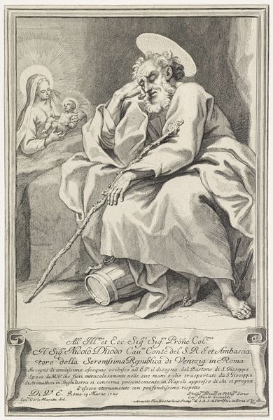 Editor: Here we have Frederick Bloemaert's engraving of "Heilige Pambo van Nitria," created after 1636. It has such stark lines; the artist really coaxes depth from simple hatching. What strikes you most when you look at it? Curator: I'm drawn to how Bloemaert uses visual symbols to represent complex narratives and spiritual ideas. Consider the two figures: one upright and observing, the other kneeling, focused intently on mending a basket. The basket, seemingly mundane, becomes a potent symbol of labor, humility, and perhaps even repentance. Does the composition resonate with any familiar stories or archetypes for you? Editor: It does evoke a sense of religious instruction, maybe a parable about simple living. But I’m not sure what’s specifically going on. Curator: Precisely! Pambo of Nitria was known for his teachings on mindfulness and the importance of inner work. Notice the downward gaze of the standing figure—it invites introspection. The act of repairing the basket contrasts sharply with the potential for idle contemplation. There’s an invitation to see value in tangible labor. Have you observed how cultural memory is transferred across diverse imagery? Editor: You mean, how the visual language connects back to earlier traditions? Curator: Yes! It's fascinating how Bloemaert synthesizes various symbolic traditions, inviting viewers across time to contemplate fundamental human values. These early prints offer us pathways into a visual tradition rooted in faith. What new meanings are unlocked for you? Editor: Thinking about symbols makes me see more layers than I expected. There's more to the image than just a quick glance allows!