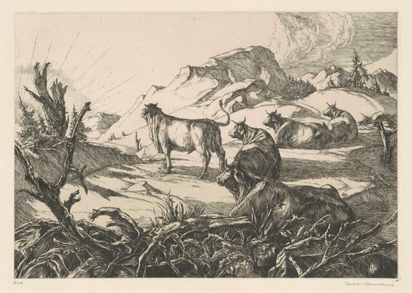Curator: Welcome. Today, we’re looking at Alfred Kubin's "The Lion Hunt," created in 1922. Kubin used ink, specifically a pen technique, to bring this intense scene to life. Editor: It’s incredibly dynamic. There’s a real sense of frenzied energy in the way Kubin has depicted this hunt; the lions look fierce, cornered even, and the hunters… well, their humanity seems diminished by the violence. Curator: The material itself, the ink, allows for incredibly fine, controlled lines, as we see in the rendering of the lions’ fur, yet there’s also an overall rawness. Kubin likely selected ink because its relatively cheap compared to other mediums; we should consider how accessibility shaped his oeuvre. Also consider that these images would’ve existed as print reproductions—reaching a wide audience in postwar Germany. Editor: Absolutely. This work hits you viscerally, forcing you to confront power dynamics, doesn't it? You see this clash, this literal life-or-death struggle between different groups—lions representing raw natural power, and humans enacting a form of colonial dominance, imposing their will on the natural world, and each other, because there seems little that unites them. They all seem at each other’s throats! Curator: I agree. And consider the production of the image. The lines create this incredible density and layering. Look at the frenetic energy in the mark-making, the sheer amount of labor embedded in the texture itself. Editor: Exactly. There's this interesting juxtaposition of the humans banded together with spears, against the individualistic struggle of the lions. It speaks to social and even gendered dynamics. Who gets to participate in power? Curator: I also find myself focusing on how a print becomes an endlessly reproducible object—reflecting mass culture and mass consumption patterns, creating an aesthetic experience tied into modern anxieties. Editor: This tension reflects not just colonial relationships but how those historical power imbalances still resonate within societies. It is about who has the right to control the narrative, both in Kubin's time and in ours. Curator: Precisely, its continued power stems from those contradictions embedded into its means of production. The ink makes it both permanent and ubiquitous. Editor: So, what starts as a snapshot of power becomes an enduring interrogation. Powerful work. Curator: Indeed, the choice of print media ensures that conversation endures.