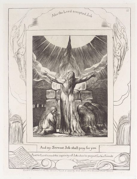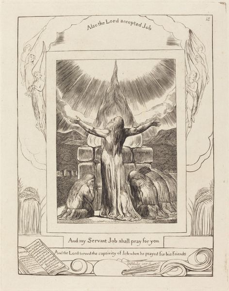 This is William Blake's 1825 engraving, "The Vision of Eliphaz". At its heart, it depicts a spectral figure radiating light, an apparition that causes the hair to stand on end. This is the spirit that appeared to Eliphaz, a figure from the Book of Job. Notice the spirit’s pose, hands clasped in front, and his ethereal glow. This posture echoes depictions of ancient prophets and seers, figures who straddle the mortal and divine realms. Think of the countless images of saints and oracles throughout history, each bearing a similar aura of otherworldly knowledge and authority. This gesture of holding one's hands can be found as far back as ancient Egypt. But here, Blake twists the trope. The spirit brings not comfort but a chilling reminder of human frailty before the divine. The figures below recoil in fear, a primal response to the uncanny. Blake taps into a deep well of collective anxiety, the unease that arises when confronted with the unknown.