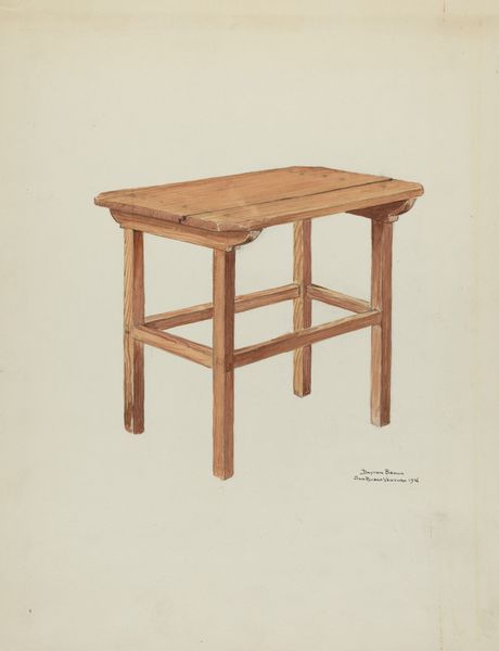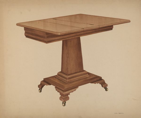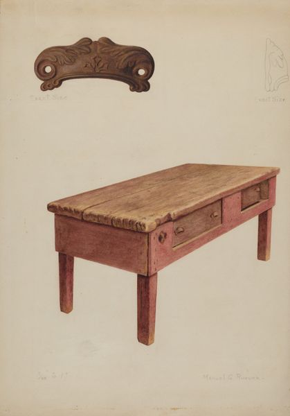 Editor: So here we have Carl Buergerniss's "Cherry Table," from around 1936, a drawing and painting made with watercolors. It feels so still and domestic. What do you see in this piece beyond a simple table? Curator: I see a loaded space! Buergerniss, during the Great Depression, focused on objects that spoke of both domestic comfort and economic anxieties. These kinds of tables, particularly within a growing middle class, signified a level of attained stability. Have you considered how an object like a simple table can reinforce, or perhaps even challenge, social hierarchies during times of widespread economic distress? Editor: That's fascinating. It does feel like more than just a table now. I hadn't thought about it as a symbol of stability during a time of crisis. So, are you saying Buergerniss is making a commentary on class? Curator: It's a possibility. We can consider how realism itself, in this context, becomes a statement. By depicting such an ordinary object with such careful detail, Buergerniss draws attention to the material conditions of everyday life. What do you make of the artist's choice to depict the table partially unfolded? Editor: It could mean that it’s trying to represent something more, beyond its purely functional use? Maybe implying a flexibility, but that might be a stretch… Curator: Not at all. It encourages us to question the singular function or static nature of this object and consider its multiple configurations, in which case it makes it more symbolic than functional. This table invites questions about usage and adaptability during a time of resourcefulness and adaptation. I'd say there is room to see the representation of these forms and how the painting process has translated into social context and gender. Editor: That makes so much sense! I'll never look at a simple object the same way again. It's a reminder of how art reflects social issues, particularly those tied to class and economics. Curator: Exactly. The object, like the period it’s emerged from, opens avenues for examining issues of identity and economics.