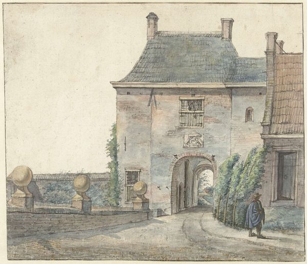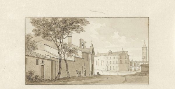 Hendrik Abraham Klinkhamer created this drawing, "Gezicht te Rijswijk," with pen in gray, sometime in the mid-19th century. The subdued palette and delicate linework evoke a serene, almost contemplative mood, inviting us to explore the spatial dynamics of this Dutch townscape. The composition is structured around a central open space framed by buildings on the left and trees on the right, creating a balanced yet asymmetrical arrangement. The buildings, rendered with precise architectural detail, contrast with the more organic forms of the trees whose overhanging branches create a canopy effect. The human figures within the scene are subtly placed, activating the space and suggesting narratives of daily life. Klinkhamer's use of perspective draws the eye into the scene, while the interplay of light and shadow enriches the textures of the buildings and foliage. This meticulous attention to detail, combined with a subtle atmospheric perspective, creates a compelling sense of depth and realism. The drawing functions as both a record of a specific place and time and an exploration of the formal qualities of line, tone, and composition.