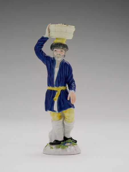 Editor: Here we have a porcelain sculpture, "Street Peddler," manufactured by Meissen. It's a delicate thing, just a few inches tall, and I find his expression rather melancholy. What stories do you think this little peddler carries with him? Curator: Oh, I imagine countless tales woven into the very fabric of his existence! He probably roams the city, hawking goods, a silent observer of life's grand theater. The Meissen artists, they were masters of capturing not just form, but fleeting emotions, weren’t they? Editor: Absolutely. It's amazing how much personality they packed into such a small figure. Curator: Porcelain itself, isn’t it a fantastic medium? Think of the fire that birthed it, and the steady hand that shaped it, so that we might reflect upon the weight of the world this peddler carries. Editor: That’s a beautiful way to look at it. Thanks for your insights!