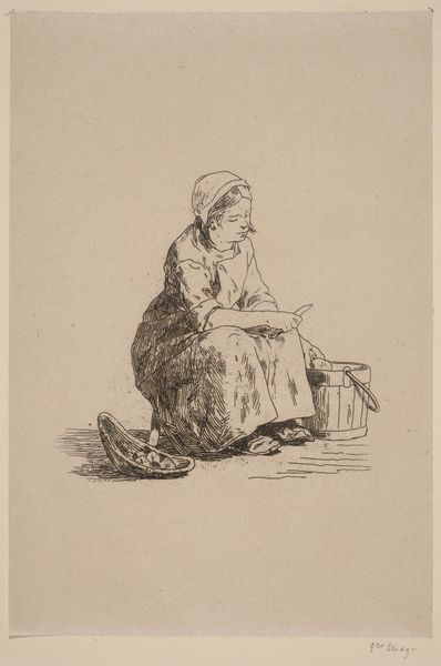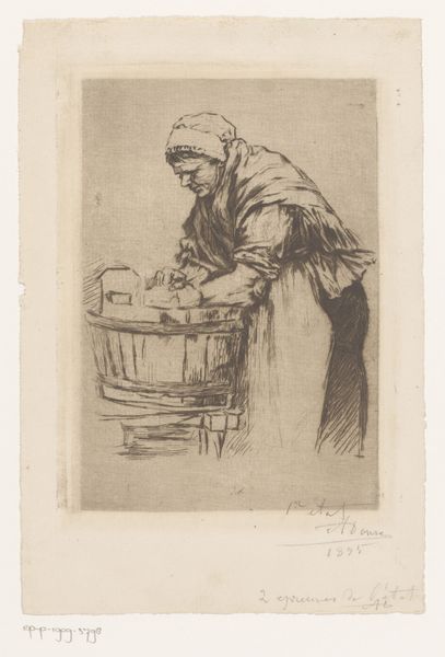 This sketch, by Johannes Tavenraat, was made with graphite on paper. It depicts a woman at work. The artist's choice of humble materials is key. Graphite, readily available and easily portable, was perfect for capturing everyday scenes. The marks are swiftly applied, conveying the texture of the woman's clothing, the rough wood of the barrel, and the weight of her labor. The paper itself, likely inexpensive, further emphasizes the sketch's accessibility. The process of sketching lends an immediacy to the work. Tavenraat wasn’t after a polished painting. Instead, he aimed to document a scene, bearing witness to the labor and lives of ordinary people. This unpretentious approach rejects the rigid hierarchy of fine art. It elevates the everyday, inviting us to consider the value of work, the beauty of simple materials, and the significance of social context.