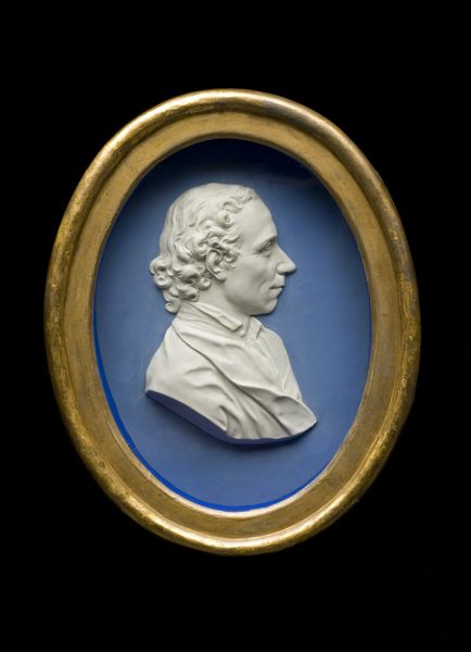 Editor: This circular relief portrays Alfred Tennyson by Thomas Woolner. Its scale is quite intimate, yet the subject seems caught in thought, almost melancholy. What do you see in this piece? Curator: I see a poet frozen in time, his intense profile forever contemplating the next verse. It's as if Woolner has captured the very moment of inspiration. Editor: It’s really beautiful. I find myself wondering what he was pondering at that moment. Curator: Perhaps "The Charge of the Light Brigade"? Or maybe something far more personal. Editor: It's fascinating how a simple portrait can hold so much. Curator: Indeed. Art is a mirror, reflecting both the subject and ourselves.