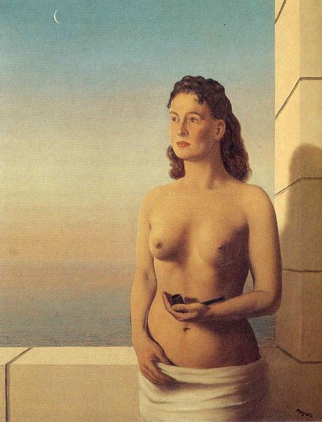 Curator: Let’s turn our attention to René Magritte’s painting, “Black Magic,” from 1945. The artist has used oil paint on canvas in this rather striking work. What are your immediate reactions? Editor: A contemplative eeriness. There's a definite dichotomy at play—the subject matter traditionally read as beautiful, idealized, classical even, yet there is a jarring application of color and division. Curator: Yes, the painting certainly creates a sense of unease. I’m struck by the stark division of the female figure’s body into two distinct color fields. The upper half is rendered in cool blues, seemingly merging with the sky behind her, while the lower half maintains a more conventional flesh tone. The formal construction seems deliberately… disjointed. Editor: Disjointed, yes, but consider the historical moment. This work was produced at the close of WWII. Could this figure represent the fragmentation of identity, particularly for women who experienced unprecedented shifts in societal roles and expectations during the war years? Her nudity also emphasizes vulnerability, making that split all the more palpable. Curator: I appreciate the reading of historical context. Yet, if we consider the painting on formal grounds, one could argue that Magritte is exploring the interplay between figure and ground, challenging the traditional representation of form. The abrupt shift in color disrupts the viewer’s expectation of a cohesive whole. It draws our eye to this artificial division, demanding contemplation beyond the surface level of simple objectification. Editor: It is not so simple for the female figure presented. Think of Surrealism, how often are female bodies placed, seemingly passively, to bear the weight of visual experiment? It asks how can one even begin to see beyond that given historical and art historical context. I suggest, at best, an attempt by the artist to explore that interplay and make space for it, rather than reinforce its power over the audience's gaze. Curator: A critical consideration of gendered gaze! And I am still caught up with the pure formalism, considering the figure as an object or field to which Magritte subjects surface experimentation... thank you, truly, for giving such nuance to these assumptions. Editor: Agreed. And considering the long and loaded art historical record, even such careful consideration as yours, is worth investigating!