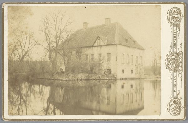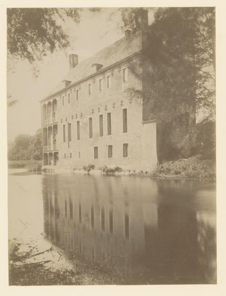Editor: This is a photograph titled "Gezicht op het Kasteel van Staverden" taken before 1928, by M.C. Termaat. It appears to be a print. I’m struck by how the still water reflects the sharp, angular architecture of the building. It creates a symmetrical, yet softened image. How do you interpret this work? Curator: From a formalist perspective, the stark contrast between the rigid geometry of the castle and the organic forms of the surrounding trees immediately captures attention. Notice how Termaat uses the verticality of the trees to frame the horizontal expanse of the water and the central structure. This tension between the natural and the constructed is visually compelling. The use of light and shadow is also masterful; observe how the reflections on the water create a secondary, almost abstract, composition beneath the more literal depiction of the castle. Editor: I hadn't considered the vertical and horizontal play in the composition before, that's a great insight. Is there significance to the monochromatic palette? Curator: Precisely. While seemingly limiting, the choice of a monochrome palette actually amplifies the textural contrasts within the image. The smooth, reflective surface of the water is juxtaposed against the rough bark of the trees and the varied textures of the castle's facade. Furthermore, consider the use of black and white as a tool to abstract from reality, to draw our attention to form and structure above all else. How might the image differ were it rendered in full color? Editor: I imagine the colors would make it a different image. Color could risk shifting our focus towards the details of the surroundings, possibly overshadowing the architecture itself. It seems as though the conscious removal of that variable invites closer consideration of line, shape, and texture instead. Thank you, this was a very helpful analysis! Curator: Indeed, and in analyzing these visual components, we gain a richer understanding of the photograph's intrinsic qualities and the artist's intent. I found the conversation very illuminating too!