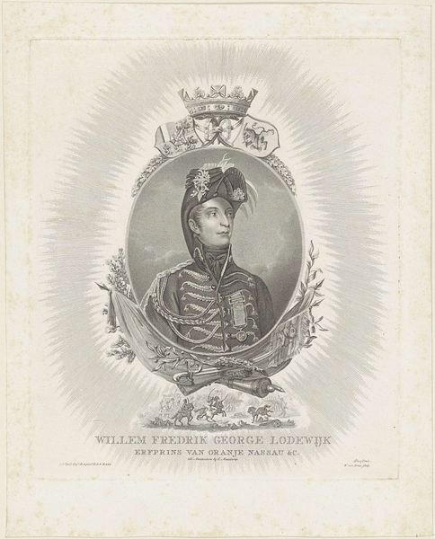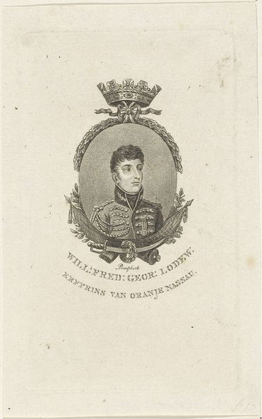 This is a portrait of Willem II, King of the Netherlands by Willem van Senus. Its small scale invites an intimate viewing, focusing attention on the sitter's features and attire. The portrait is framed within an oval, decorated with foliage and crowned with royal symbols. The artist meticulously uses hatching and cross-hatching to define form and texture. Notice how the gradations of light and shadow articulate Willem's face and the details of his military garb. This technique not only demonstrates Senus's skill but also adds depth to the image. Consider the semiotic weight of these elements. The crown, wreath, and military uniform are all signs of status and authority. The portrait doesn't merely represent Willem II; it constructs and reinforces his identity as a leader and monarch. Art is thus not just a reflection of reality, but an active participant in the construction of power and meaning. This work exists within a visual language that both communicates and perpetuates specific social values.