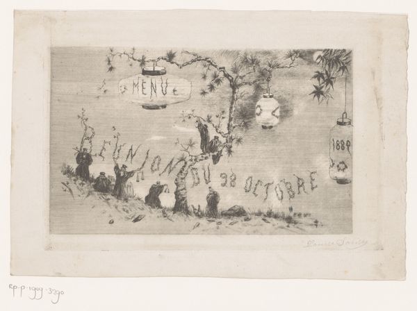 This is a black ink drawing called "Juleaften i Rom," or "Christmas Eve in Rome," created by an anonymous artist. It is a scene divided into two distinct registers: the upper part depicting festive ornaments, and the lower part showing a distant view of the city of Rome. The artist uses circular medallions alternating with palm-like decorations to create a frieze-like effect. Within each circle, stylized figures are captured in various poses, evoking classical motifs. Below, the cityscape is rendered with fine, precise lines, giving it an almost dreamlike quality. The stark contrast between the ornamental and the architectural creates a visual tension that invites us to consider the relationships between representation, memory, and cultural symbols. How do these choices in composition and form reflect broader artistic and philosophical concerns? The drawing does not offer easy answers, but provides an opportunity to contemplate the layers of meaning embedded within its structure.