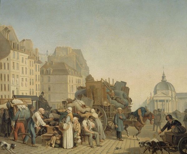 Editor: This is Wilhelm Marstrand's "Street Scene in the Dogdays," painted in 1832. It’s such a bustling, chaotic scene. Everyone is caught up in something, and I'm particularly intrigued by the figure attempting to catch dogs with a net. What stands out to you in this painting? Curator: Ah, yes, pandemonium with a very fine brush! To me, this is more than just a snapshot of street life; it's Marstrand’s cheeky commentary on human… and canine… nature. Look at the social strata on display. From the bourgeois dog owner desperately clinging to his pampered pooches, to the bare-chested working man with the net – an early form of "dog control," perhaps? It’s a clash of classes, wouldn’t you say? A very theatrical, almost operatic scene... I wonder what Marstrand thought about romanticism; clearly his own dose of reality seeps through here. Do you feel any satire in the gestures or faces? Editor: I do see that now – especially the contrasts in clothing and the way people are interacting. I hadn’t really considered it satirical, more observational, but the expressions are definitely exaggerated. Curator: Exactly! It’s the exaggeration that tickles my funny bone. That fellow struggling with the dogs looks so comically exasperated, it reminds me of myself trying to herd cats - although perhaps those cats had fleas. Tell me, does it evoke a specific mood for you, outside the general idea of chaos? Editor: I see a little bit of humor in the desperation. Like, they are suffering together in the summer heat and a chaotic place. Curator: Yes, they all seem so stressed... Well, that brings a deeper hue to the 'Dog Days' then! We project, as viewers, into such complex narratives that come out of one, beautifully detailed, and seemingly simple canvas. Editor: I really hadn't looked at it beyond the surface level, now I see the cultural commentary hidden underneath. It's pretty thought-provoking how much you can glean from just one snapshot of the 1800s street scene! Curator: Absolutely! It shows you how paintings can serve as vibrant historical documents - all filtered, naturally, through the artist's unique gaze. Just glorious!