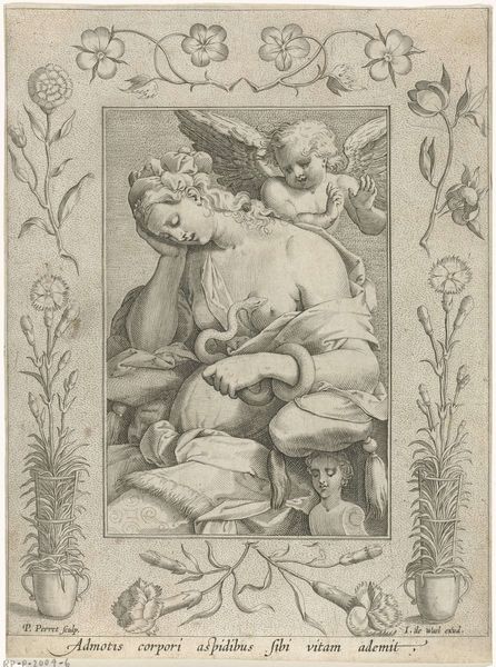 Editor: This engraving, "Twee elkaar liefkozende goden," or "Two Gods Loving Each Other," by Jacob Matham, dates back to the early 17th century. The way the figures are nestled together in the foreground, contrasted with the crowded scene in the background, makes me wonder about the story being told. How do you interpret this work? Curator: This image, while seemingly idyllic, operates on multiple levels. We see a foreground that depicts intimacy, but is that intimacy available to everyone represented here? The print speaks to a very specific, and very elite, understanding of love and pleasure in the early 1600s. Consider who had access to such leisurely scenes – the people at the table. Now consider those figures surrounding them; are they included in the festivities? Editor: I hadn't thought about it that way. It seems to present a kind of social stratification through the lens of mythology and pleasure. Curator: Exactly. It asks us to question who gets to participate in these "universal" experiences, like love and celebration. Are those experiences genuinely available to everyone, or are they reserved for a select few? It forces us to think about the political implications embedded within seemingly harmless images of beauty. Consider the power dynamics at play in Matham’s presentation of both figures and composition. Do you observe such themes represented even today? Editor: That's fascinating. It makes me rethink how I see not only this piece but other seemingly straightforward depictions of love and relationships. Curator: Precisely. Art can be a mirror reflecting not just beauty, but also the societal structures that determine who gets to define beauty and who benefits from it. Editor: Thanks! I’ll definitely keep these ideas in mind as I study art history. Curator: A keen eye can reveal hidden stories everywhere; don't stop looking.