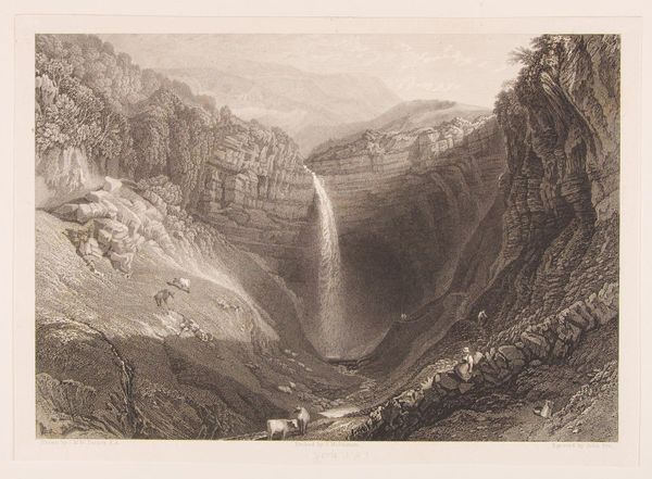Editor: Here we have Nicolas Chapuy's "Waterfalls of Tivoli," a print combining lithography and etching on paper, created around 1848. It’s quite striking – the contrast between the dark, jagged rocks and the smooth, flowing water immediately grabs your attention. What elements stand out to you in this composition? Curator: Immediately, the careful balance achieved through contrasting textures arrests the eye. Note the deliberate arrangement: the cascading waterfalls offset by the solidity of the rocky foreground and the distant architecture. This interplay generates a certain tension and visual interest. Further, consider how light and shadow work together to emphasize the different spatial planes. What strikes you about how depth is created in this work? Editor: I think the layers – the foreground rocks, the waterfalls, then the mountains receding into the background – give a good sense of distance. It feels vast. The etching helps with that detail. Are there particular compositional techniques at play here? Curator: Indeed. The artist employs strategic blurring of forms in the background and varies the degree of contrast, manipulating light to guide the viewer's eye. This visual recession is further augmented by a subtle aerial perspective. Notice also the linear structure reinforced by the verticality of the falls and rock forms. Editor: That makes sense. I see now how the vertical lines guide your eye upward, drawing you into the distance. It's almost like a stage, meticulously constructed. Do you see this staged structure enhancing the viewing experience? Curator: Yes, that architectural quality creates an artificial yet engaging scenic vista. This artistic approach showcases the possibilities of pictorial structure, creating aesthetic value. The very nature of the composition underscores the careful formal planning inherent in the image. Editor: That's fascinating! It's less about a realistic depiction and more about the arrangement of forms. I initially focused on the landscape but now see that the artwork is meticulously constructed and has different structural depths, light quality and a carefully selected technique that create space, draw our eye, and make it all feel both natural and contrived. Curator: Precisely. Shifting perspective allows for an entirely novel appreciation of representational form.