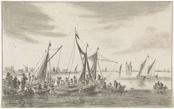 Curator: Salomon Savery created this engraving, "Festive Procession of Ships Before Amsterdam," a bustling scene rendered with incredible detail. Editor: It's captivating! The monochrome palette and tight composition give it an intense, almost frenetic energy. Curator: Indeed. This work provides insights into the celebratory culture of Amsterdam. The numerous ships suggest a significant event, maybe a state visit or a trade victory. Editor: I wonder, who is included in this celebration? Are these people of all races and genders sharing in the joy, or is the celebration an exclusive affair for the wealthy elite? Curator: That’s a crucial question. The scale of the celebration would undoubtedly have socio-political ramifications, serving as a tool for solidifying power structures. Editor: Viewing it through this lens makes me think about accessibility and representation in these types of public displays. Curator: Precisely, it urges us to consider the artwork within the broader context of the era and its intersectional narratives. Editor: Thank you; I appreciate this reframing! Curator: My pleasure. History gives such richness to art analysis.