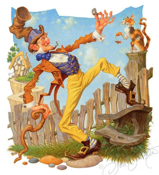 Here we see "Humpty Dumpty Sat on a Swing" by Scott Gustafson, where the iconic egg sits jovially on a book, suspended by ropes against a backdrop of clouds. Humpty Dumpty, drawn from an old English nursery rhyme, initially appears as a symbol of fragility, poised for a fall. But note his whimsical, carefree expression. He embodies a paradox of vulnerability and joy, riding on a book, suggesting knowledge or wisdom as his support. The act of sitting on a swing is, in itself, an ancient motif, evoking freedom and a return to childhood innocence. Recall images of Eros on a swing, or even the goddess Fortuna, both symbolizing the volatile nature of fate. Humpty Dumpty's precarious perch, combined with his oblivious glee, engages the viewer on a deeper psychological level. The cultural memory of the nursery rhyme clashes with this depiction, reminding us that symbols are never fixed. They evolve, gain new layers, and resurface in unexpected forms, carried by the currents of time and imagination.