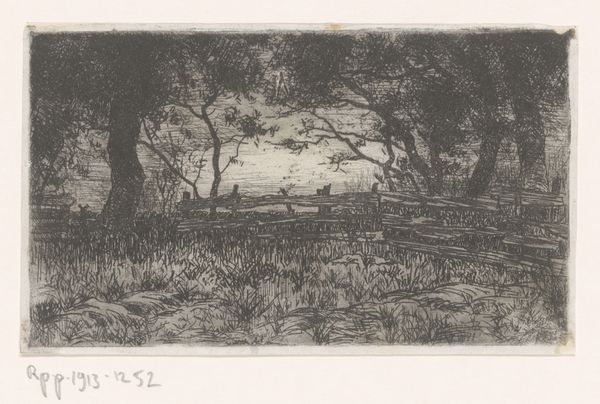 Curator: Before us is Auguste-Louis Lepère’s “The Dead Apple Tree,” an etching on paper created in 1913, residing here at the Art Institute of Chicago. Editor: There's something hauntingly beautiful about this. The stark lines of the dead tree dominate the landscape, almost like a skeletal hand reaching out. Curator: Lepère was a master of etching, and it’s fascinating to consider how he used this medium to capture such a desolate yet pastoral scene. The process of etching itself, with its biting into the metal plate, seems apt for conveying the starkness of the subject. Think about the labor, the time etching all those tiny details required. Editor: Absolutely. The etching allows for incredible detail. Notice how the light catches the textures, the rough bark of the tree, and the grassy field. I'm also intrigued by how this image functions within a broader historical context. In 1913, just before the first World War, this image might have been read as a symbol of loss, of a dying way of life in rural France. Curator: That's a great point. Also consider that Lepère wasn’t just any artist, he also made propaganda posters during the war and that artistic background brings with it ideas of the politicization of the art world and the use of printmaking during conflict and tension. Editor: I see how that connection complicates our understanding of the artwork. Does it subtly critique industrialization and its impact on the environment, or is it merely a melancholy reflection on the changing rural landscape? I also think that we should think about the role museums play in bestowing value to works, and who makes these works ‘worth’ something, so to speak. Curator: Right. The social and political undercurrents can't be ignored. The selection of this subject is not a politically benign one in this timeframe. It all boils down to understanding that the image on view here isn't an objective slice of nature, but something mediated and manipulated. Editor: Well, reflecting on our discussion has shown that an image, simple or striking, speaks differently through changing times and varying conditions, especially considering where the artwork currently sits and is received. Curator: Precisely, reminding us that a material and historical approach can peel back layers and unearth deeper connections to reveal powerful works with a long reach, such as "The Dead Apple Tree."