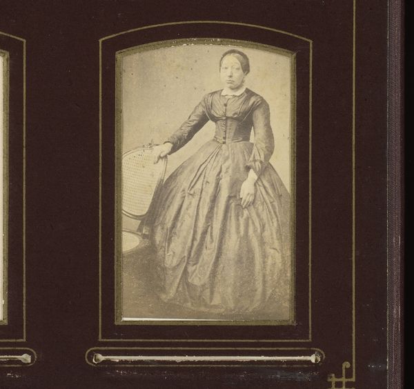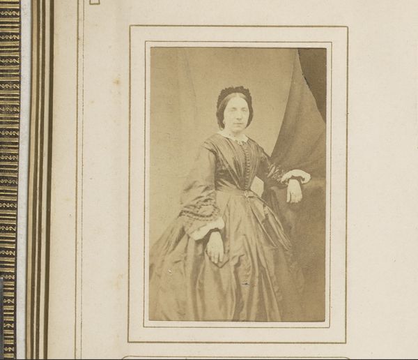 Editor: So here we have a gelatin silver print from between 1857 and 1908 by Woodbury & Page, titled *Portret van een vrouw, zittend aan een tafel*. It's a portrait of a woman sitting at a table, quite formal, almost imposing, and I’m curious what stood out to you about this particular image? Curator: I think it’s important to consider the historical context of photography at this time. Portraits like this one provided a sense of social identity and permanence. For women, who were often marginalized in public life, such a portrait could represent an assertion of self. Consider the implications of photographic technology; Who had access? How did they wish to be represented? Editor: That's a great point about representation. It makes me wonder how much agency she had in constructing her own image, versus the photographer imposing a certain ideal? Curator: Precisely! Think about the very deliberate pose, her dress, even the set; these all communicate specific ideas about class, status and, ultimately, power. How does it reflect and perhaps even challenge patriarchal norms of the era? This image then becomes part of a much wider social and political dialogue. Do you notice any tension between these expectations and the sitter's own personality? Editor: Now that you mention it, her gaze seems direct and self-assured, which is in stark contrast to the restrictive clothing and setting. Curator: Exactly. The photograph is more than just a representation, but evidence that, despite limitations imposed upon women at that time, she still was very determined to make a claim to independence. Editor: Thanks, this made me think about portraiture and identity from an angle I had not previously considered! Curator: And I found myself reminded of the inherent power dynamics present even in seemingly straightforward portraiture.