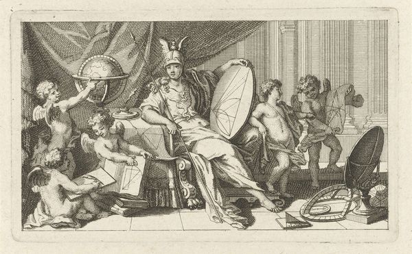 Jacob Folkema created this engraving, "Astronomie in een vertrek," sometime in the 18th century in the Netherlands. The image presents a scene of allegorical learning and leisure. A woman, perhaps representing Urania, the muse of astronomy, sits with a book, while a cupid figure playfully engages with astronomical tools. In 18th century Dutch culture, the rise of scientific inquiry coincided with the enlightenment. The inclusion of both the muse and the cupid can be seen as an allegory of the synthesis of both reason and passion in the pursuit of knowledge. To further understand this work, we might research the cultural role of scientific societies in the Netherlands during this period. The Rijksmuseum’s collection can tell us a great deal about the visual culture and social values of the time. Such investigation can reveal the complex social and intellectual context in which this print was created.