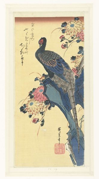 Utagawa Hiroshige made this woodblock print, Kingfisher and Chinese Bellflowers. The composition arranges two distinct zones, one above the other, which gives a visual echo—the curve of the bellflowers parallels the kingfisher’s dynamic posture. The bird, wings outspread, dives with an arrow-like intensity, showcasing Hiroshige’s keen eye for detail and motion. The bellflowers below complement this action. They provide a natural counterpoint with their delicate forms and muted blues and greens. The texture achieved through the woodblock technique adds depth and tactile interest, inviting closer inspection of the individual marks and impressions. In Japanese art, birds and flowers often symbolize the seasons. They also mirror human emotions or social situations. Here, the kingfisher’s dive might be seen as a metaphor for decisive action or the pursuit of knowledge. The gentle bellflowers suggest themes of resilience and beauty found in everyday life. The print functions as a meditation on nature's harmony and the transient nature of life.