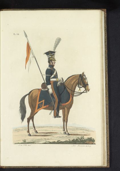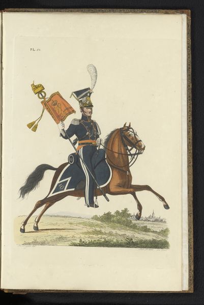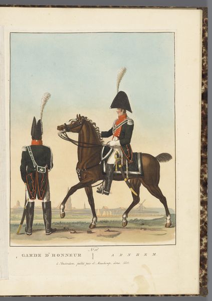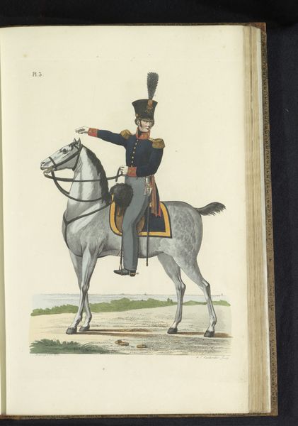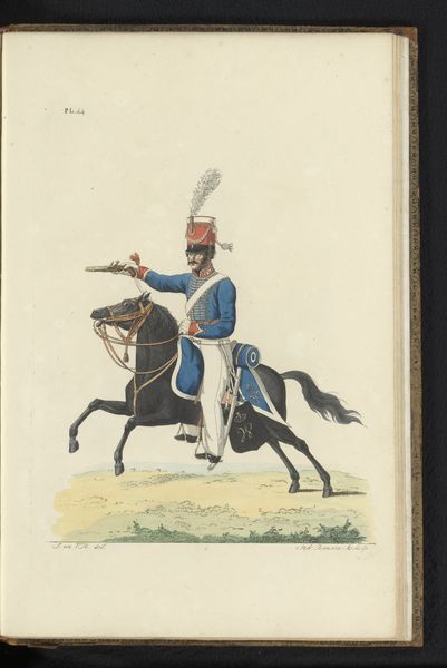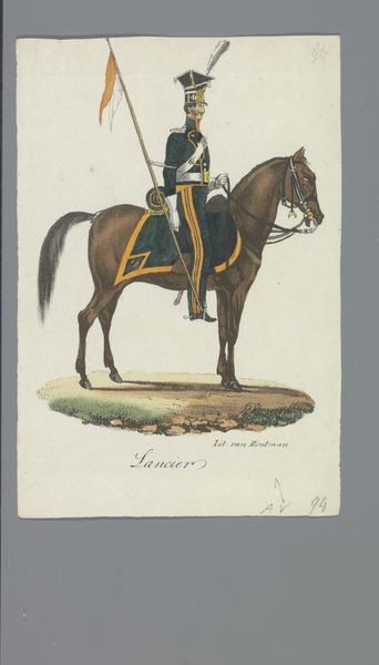 Editor: This is "Maréchaussée, te paard, in groote tenue" from 1823 by Joannes Bemme. It's a watercolor and feels so precise and illustrative. How would you interpret this piece? Curator: I see it primarily as a document of production. Consider the watercolor medium – relatively inexpensive and easily transportable. It speaks to a need for efficient record-keeping within the military context, wouldn't you agree? This wasn't about high art, but about generating accessible visuals of uniforms. Think of the labor involved in the meticulous rendering of each detail, from the braiding on the uniform to the horse’s musculature. Editor: So, it's less about artistic expression and more about… industrial representation? Curator: Precisely! The artist becomes an artisan. The repetitive nature of these uniform depictions reflects the broader military-industrial complex. Moreover, the watercolor itself – how was it sourced, produced, and distributed? Was this watercolor a local product? Did that influence the piece? The raw materials dictate so much! Editor: That’s interesting, viewing it through the lens of material production. I usually think of Romanticism as focused on emotional expression, and hadn’t considered the practical side. Curator: Exactly! The dominant ideology might celebrate individual genius, but a materialist approach unearths the often-invisible labor and material conditions that underpin artistic creation. Editor: I hadn't thought of Romanticism through that lens, so it really broadens the way I view the work now. Curator: Indeed. Examining art in terms of its production reveals deeper meanings embedded in even the most seemingly straightforward image.