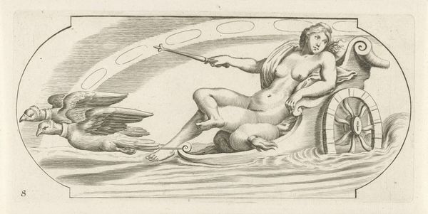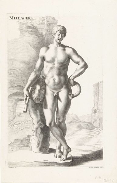 Editor: Here we have "Mercury by the Seashore," an oil painting from the 1790s by Nicolai Abildgaard. I'm immediately struck by the figure's relaxed pose, which is almost in opposition with Mercury's traditional, active character. What do you see in this piece? Curator: It is interesting how Abildgaard uses the horizontality of the figure and landscape to create a tranquil atmosphere. Notice the precise arrangement of the limbs; the arc of the body creates a visual echo to the sail of the ship at the horizon. This emphasizes the formal elements of the composition and how they create meaning. What effect does the monochromatic rendering have, do you think? Editor: It feels austere, and almost statue-like, as if the artist is trying to capture a sense of classical sculpture. Does the grayscale limit the emotional impact in some ways, perhaps reinforcing a stoic detachment? Curator: Precisely. Abildgaard has reduced the color palette to a minimum, focusing instead on form and line to evoke a sense of timelessness. The deliberate brushwork and stark tonal contrasts enhance the figure’s contours and its inherent shape. Also, consider the winged helmet as just a formal, geometric element. What happens if we focus only on how the helmet, the sail and the white shroud compliment each other visually? Editor: I see now. It is less about mythology and more about how shapes interact with each other within the painting itself. It reframes the artwork around artistic forms, rather than divine allegories. Curator: Exactly. By concentrating on line, form, and tone, the painting showcases the very essence of artistic construction and intention. Editor: Thanks, that really sheds light on a whole new perspective. Curator: My pleasure, that’s the power of art.