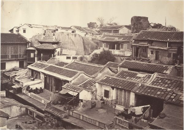 Tamamura K. created this tinted photograph of Nagoya Town around the turn of the 20th century. It presents us with a bird's-eye view of a Japanese townscape dominated by traditional architecture, especially the towering pagoda. During this period, Japan was undergoing rapid modernization and westernization, transforming from a feudal society into an industrial power. Photography played a crucial role in documenting and mediating these changes. This image, with its careful composition and hand-tinted colors, offers a glimpse into a Japan caught between tradition and modernity. The presence of both religious structures and vernacular houses reflects the complex social fabric of the time. To understand this photograph fully, we would need to delve into the history of photography in Japan, its relationship to tourism and cultural exchange, and the social and economic forces shaping urban development. Only then can we truly appreciate its significance as a historical document and a work of art.