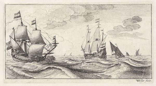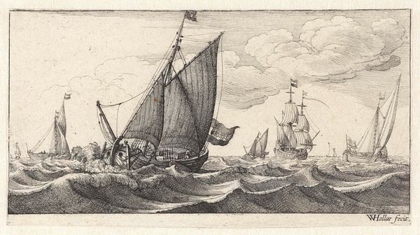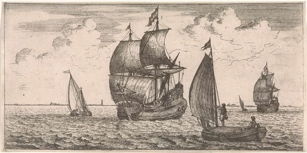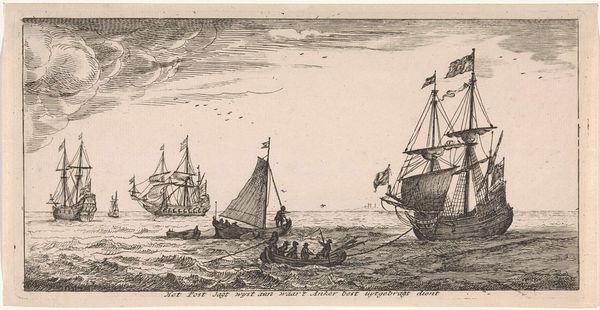 Curator: Well, the weather certainly looks dramatic. I feel a strong sense of foreboding just gazing at this image. Editor: Indeed! The artwork we are looking at is entitled "Een loodsman komt aan boord van een schip," or "A Pilot Coming Aboard a Ship." This etching by Joost van Geel, created sometime after 1666, really captures a tumultuous seascape. Curator: The composition is quite masterful. Note how the diagonal lines of the ship's masts and the cresting waves lead your eye directly into the heart of the scene. There is almost a deliberate dynamism in the arrangement. Van Geel employs intricate hatching and cross-hatching to convey the texture of the water and the billowing clouds. Editor: But what does this scene reveal about the Dutch Golden Age, a period of maritime expansion but also brutal colonization? The presence of the pilot boarding hints at the Dutch Republic's reliance on skilled navigators, reflecting the expertise required to maintain their expansive trade routes but for what cost, right? Curator: Certainly. But observe the subtle ways the light and shadow play across the sails. The engraver directs our eye by increasing density. The interplay here isn’t just technical; it lends a certain emotional gravitas to the image that exceeds mere technical mastery. Editor: I see it somewhat differently. Think of the power dynamics inherent in maritime activities during this time. The arrival of the pilot could also symbolize control and domination of the seas. And where did these pilots get their expertise? The etching offers a beautiful scene at first glance, but digging a bit more reveals more troubling questions. Curator: While I appreciate your reading of it through a socio-historical lens, I still think it important not to lose sight of the formal achievement. Van Geel's use of line alone is incredibly sophisticated! Editor: I concede that the artist displays immense skill but I think our role in presenting artwork is not just to showcase its aesthetic properties but rather discuss how they function to mirror social power relations and cultural perceptions. Curator: Ultimately, "A Pilot Coming Aboard a Ship" resonates due to the engraver's facility in portraying something beautiful through considered artistry. Editor: Absolutely! And in confronting narratives interwoven with historical context and its ongoing legacies, this work really reveals itself to be very powerful.