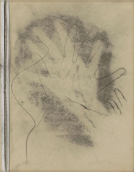 Curator: Before us is "Hand met gespreide vingers," or "Hand with Spread Fingers," a pencil drawing on paper by Willem Witsen, dating sometime between 1874 and 1923. Editor: There's something wonderfully hesitant about this. Like Witsen's hand was sketching *his* hand, but with a question mark hovering just above the paper. It's as if he were discovering the form anew. Curator: The line work is undeniably delicate, almost tentative. We see a clear engagement with form through the subtle variations in pressure, giving dimension and movement, despite the clear minimalism. Editor: Exactly! Look how those tentative lines create a ghostly echo of the hand’s position. It's a gesture captured in fleeting time, an ephemeral dance of fingers. I mean, has anyone ever *not* doodled a hand? Curator: True. But consider the context: Witsen was a key figure in the Dutch Impressionist movement. This study could be a means of exploring human form—the way light plays across skin and bone. It’s all there in those few simple lines. Editor: Maybe. Or maybe he was just bored! There’s this charming imperfection, right? The almost childlike simplicity rescues it from feeling academic. You can feel him there, pencil in hand, in a quiet moment. It whispers of an intimate practice. Curator: Still, by isolating the hand, Witsen forces us to really *see* it—as a complex structure of lines, planes, and volumes. The composition becomes about the hand itself, rather than a narrative it may support. Editor: I love how it leaves space for my own interpretation. It’s an open invitation to engage, to project, to remember the feeling of my own hand resting on a page. It’s humble and profound, all at once. Curator: Indeed, it underscores how formal constraints paradoxically can amplify personal resonance. Editor: See? I just feel the quiet of his studio, the scrape of the pencil. Beautiful.