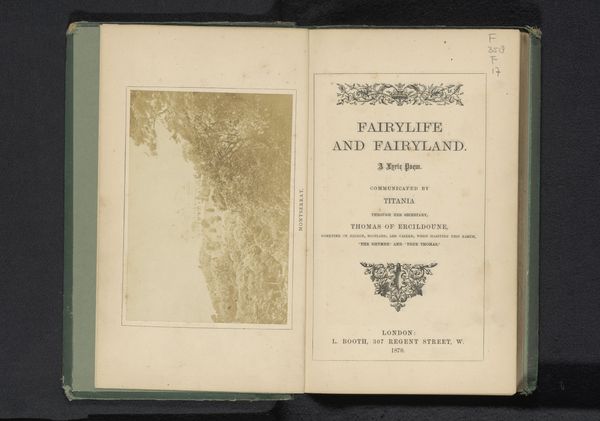 Editor: So, here we have “Fairylife and Fairyland,” a lyric poem from 1870 by Thomas of Ercildoune, displayed in what looks like an aged, personal sketchbook. The delicate albumen print on the left page is stunning, though quite faded, and evokes such a sense of dreamy otherworldliness. What's your interpretation of the piece? Curator: Otherworldliness indeed! Doesn't it feel like stepping into a forgotten time? I get this sense of nostalgia, like the photograph itself is whispering stories of faerie realms and long-lost magic. Notice how the landscape in the albumen print, slightly blurred, appears almost dreamlike. The Romantic period was obsessed with nature and the sublime. What might a modern eye make of it, do you think? Editor: I think the stark contrast between the hazy landscape image and the very crisp, formal text of the title page kind of encapsulates the tension between reality and imagination that Romanticism explores. Curator: Precisely. Thomas of Ercildoune—a name shrouded in folklore—presents us not just with an image, but an invitation. An invitation to question the veil between worlds, and consider, perhaps with a knowing wink, that the mundane holds the potential for enchantment. Makes you want to go on a quest! Editor: It definitely does! I find the handmade, almost scrapbook quality incredibly charming. It reminds me of artists meticulously building their own worlds, piece by piece. Thanks, that was fascinating. Curator: My pleasure. Art, like fairy tales, offers us glimpses into ourselves. Keep seeking those glimpses.