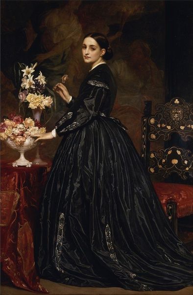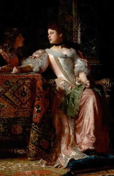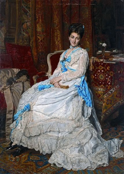 Editor: "Aprés la visite," painted by Victor Gabriel Gilbert in 1877. It's oil on canvas and gives the impression of a fleeting moment, right after someone elegant came for a visit. What social commentary do you think this piece offers? Curator: It presents a very curated vision of femininity and societal expectations. Gilbert's attention to the dress, the hat, the gloves, and even the carefully posed dog – it’s all deeply connected to the rise of consumer culture and bourgeois aspirations in late 19th-century Paris. Think about it: how does this imagery uphold or perhaps subtly critique the commodification of women’s roles? Editor: I see. So it's not just a pretty picture, but also a commentary on social status and gender? The meticulous detail feels like it's almost mocking the elaborate rituals of the upper class. Curator: Exactly. Look at the almost theatrical staging of the figure and her accouterments. Everything is placed to convey a certain image, a carefully constructed performance of wealth and respectability for public consumption. Is it genuine or artificial? Is Gilbert simply documenting reality, or is he commenting on the superficiality of these social displays? Editor: That's a great point! So the very act of painting it and displaying it is participating in this performance, isn't it? Like a mirror reflecting society back at itself. Curator: Precisely. Consider how Impressionism, while ostensibly about capturing fleeting moments and light, also became entangled with portraying modern life and its social complexities. Gilbert, through this painting, prompts us to think about the role of art itself within the very society it depicts. Editor: I'll never look at genre paintings the same way again. I hadn’t considered the politics behind portraying everyday life. Curator: Art, especially figurative art like this, isn’t just about what's on the surface. It’s a window into the complex interplay of power, culture, and representation.