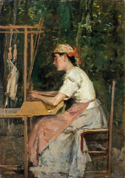 Editor: Here we have Renoir’s "The Reader (Seated Young Woman)," painted in 1887. The oil paint creates this wonderfully soft texture. I’m really struck by how intimate and quiet it feels, like we've stumbled upon a private moment. What draws your eye in this piece? Curator: Oh, the light, definitely the light! It dances across her face, that rosy hue Renoir was so fond of. He wasn't just painting a woman reading; he was capturing a feeling, a mood. Tell me, what do you think she's reading? A romance, perhaps? Or something more serious? Editor: I hadn’t thought about the story within the story. Maybe it’s a letter? That would explain the intensity. Why do you think he chose such a subdued palette, keeping most of it greens and whites? Curator: Ah, the greens are quintessential Renoir! They weren't just background, but another layer to the story. And those whites, they pop and give it depth. The impressionists aimed to record what they saw and not necessarily make it realistic or literal. It’s interesting isn’t it how we still strive for accuracy? Editor: It is! I hadn't considered that relationship with light as being integral to his storytelling either. Curator: You know, Renoir makes us feel something visceral, and personal. Almost like we've met this woman or experienced what she has gone through personally, which is an act of painting magic in my view. Editor: It really is! I'll never look at Renoir the same way now, thank you. Curator: And I'll never forget this young lady who is so very keen on whatever book is being offered up to us at that time! What an extraordinary piece.
