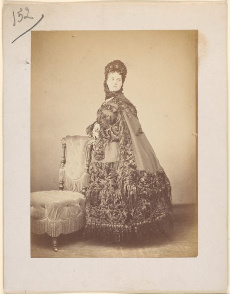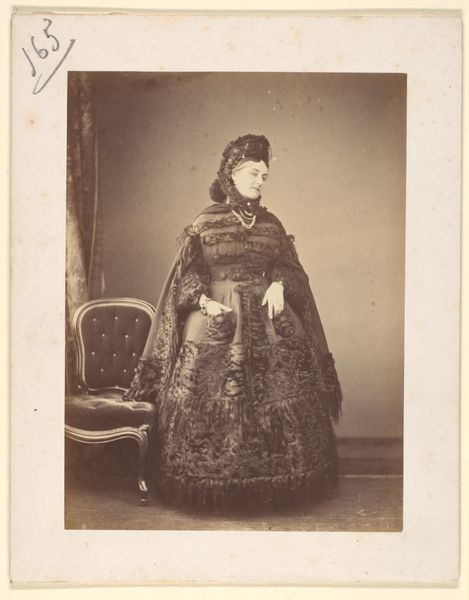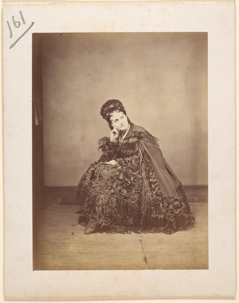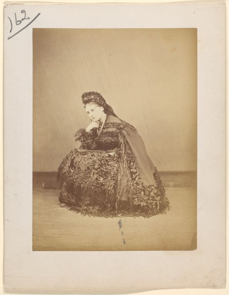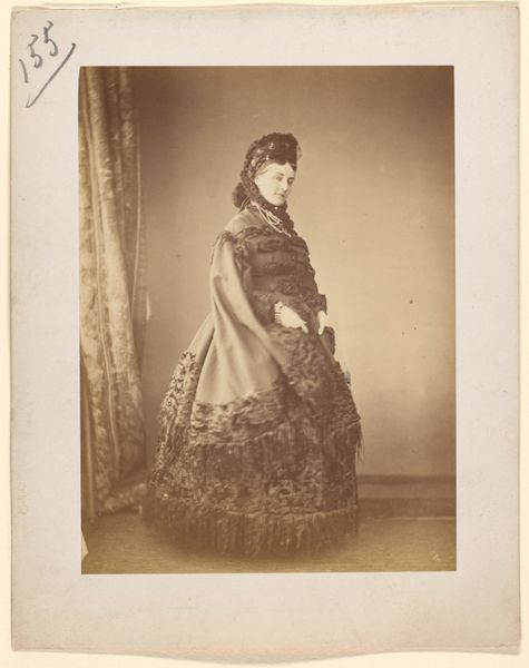 Curator: The portrait before us, "Le Caracul (L'Astrakhan)," was taken in the 1860s by Pierre-Louis Pierson. It's a stunning example of a daguerreotype, a very early photographic process, now housed at the Metropolitan Museum of Art. Editor: There's such a dreamy, almost ethereal quality to this portrait, due in part to the monochromatic palette and the soft focus characteristic of the daguerreotype. I'm particularly drawn to the textural interplay—the woman’s elaborate dress seems to swirl around her. Curator: Yes, the material culture on display speaks volumes. The lavish fur accents—presumably astrakhan, giving the image its name—immediately signify a certain social standing, but I wonder how such elaborate presentation plays into gender roles of the era, presenting femininity as inherently tied to extravagance and display? Editor: The folds of fabric are interesting too, notice how the dark fringe at the bottom adds visual weight, grounding the image. Structurally, her almost centralized position creates a powerful sense of balance. The soft gradations in light emphasize a controlled and refined formal approach. Curator: And we shouldn’t forget the implications of early photographic practices. These portraits were revolutionary, offering new avenues for representation but also reflecting power dynamics inherent in who had access to be seen and how they were portrayed. Think about the implications for wider representation—who could afford the luxury of photographic portraiture? Whose image mattered enough to be captured and preserved? Editor: An important point. It shifts the gaze. And yet the pure detail offered by the daguerreotype is astounding when you compare it with what came before— the surface almost shimmers! I see something compelling in the rendering of light and shadow across her face. Curator: For me, it brings up issues surrounding wealth, labor, and visibility that still resonate today, revealing complexities inherent to representations of women in art. This image prompts essential questions about what photography can and cannot reveal, challenging assumptions that link artistic creation to objective truths. Editor: I agree—while understanding its sociohistorical context is vital, one can also appreciate Pierson’s expert craftsmanship and attention to compositional harmony in "Le Caracul." A rich, compelling visual object, definitely. Curator: Ultimately, it is this tension between form and context that allows for this photographic artwork to continually incite insightful observations and discussion.